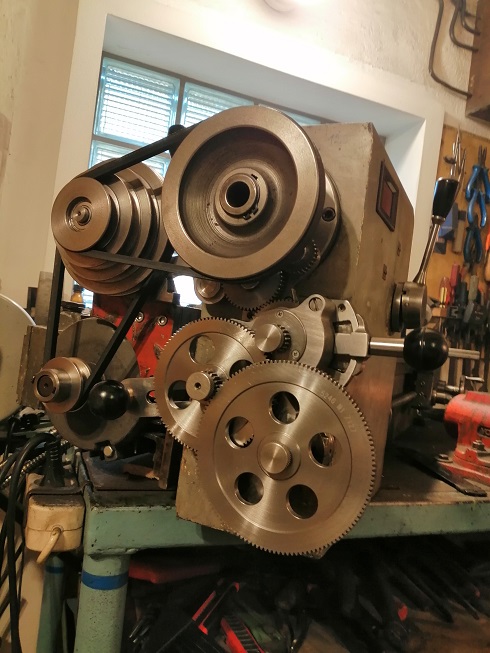 Použil jsem polotovary oz. kol s modulem 1 a už jenom počítal a počítal a soustružil a frézoval. Dostal jsem se na hodnotu stoupání 0,04mm->3mm na otáčku. Vodící šroub má stoupání 2mm, ale vloženým kolem jsem to změnil na 1,5mm, abych mohl použít všechny kovová kola, co mám k malému číňankovi. Dokoupil jsem jen kola se 100/120/127zuby.