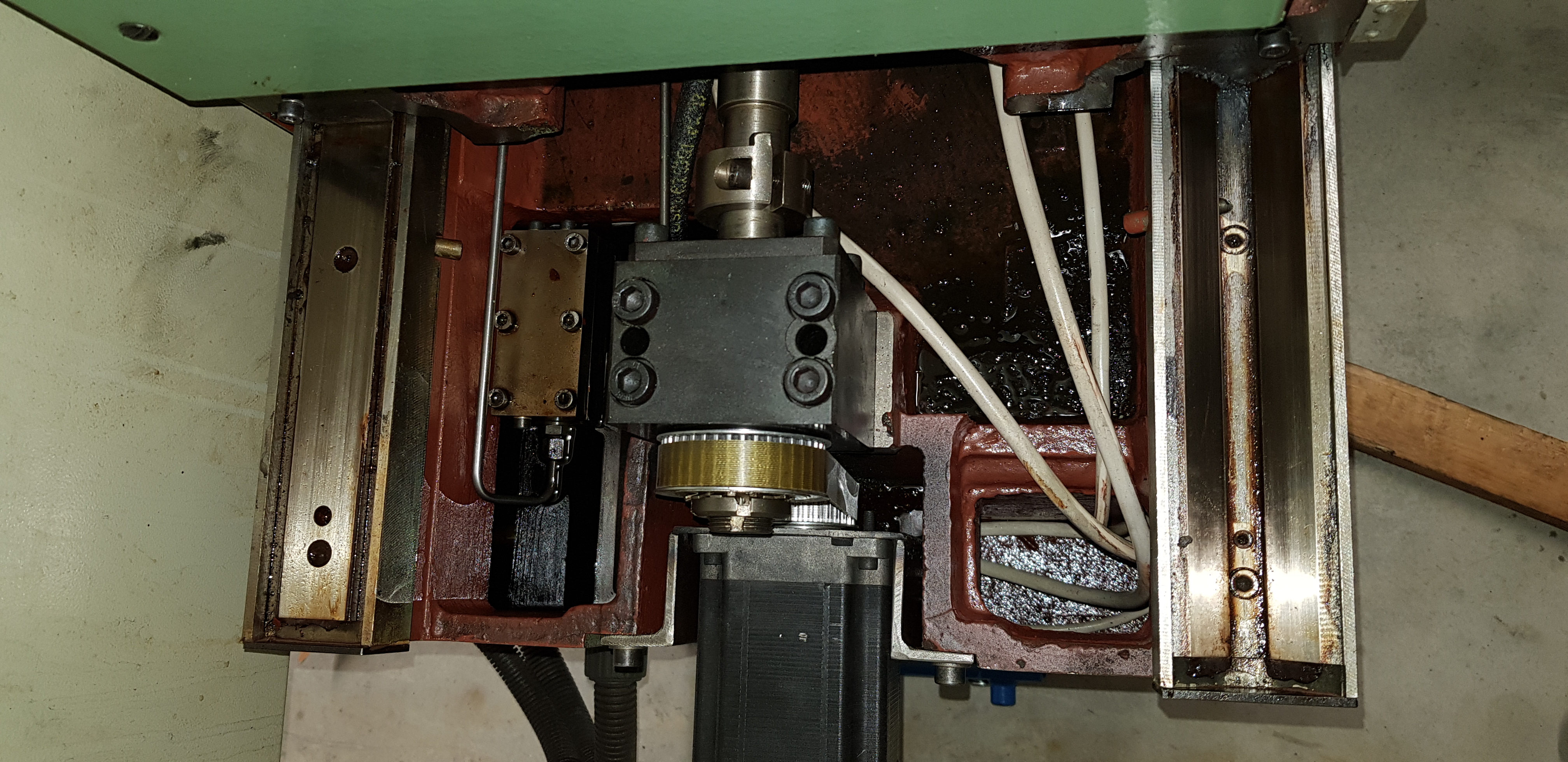 No a jinak, jsem měl připravené lišty na vypodložení stojanu ale nebyly potřeba, jelikož stojan není na válečkách, ale na kluzném vedení s turcitem. Stejně tak vedení stolu je na turcitu. Navíc, stojan, stůl a pravděpodobně i vedení vřeteníku je hydrastatické. Jdou sem trubky od hydraulického agregátu a pak to samospádem zase teče zpět do něj. Na příčném posuvu je šroub s krokovým motorem. U kterého mě vcelku pobavila ta jeho příruba, kus plechu a dva přivařený vingle. Nevím jestli to takhle udělali ti co dělali GO, nebo už to takhle bastlili v té firmě odkud jsem to koupil. K té brusce mám veškerou dokumentaci od roku 1991 co jí ze ZVL firma pořídila. Včetně veškeré korespondence mezi ZVL a firmou a pak všech faktur od prvotního pořízení, za následný několikerý servis, i samotnou GO. Pěkné počtení to je. Faktura z roku 1991 byla 344.100,- Kč za stroj, + dalších 57tis. za zvláštní příslušenství. Příslušenství mi dali ke stroji, 2krát sinusový stůl, vyvažovací stojánek, asi 20přírub, radiusový orovnávnávač, odmagnetovač a další.