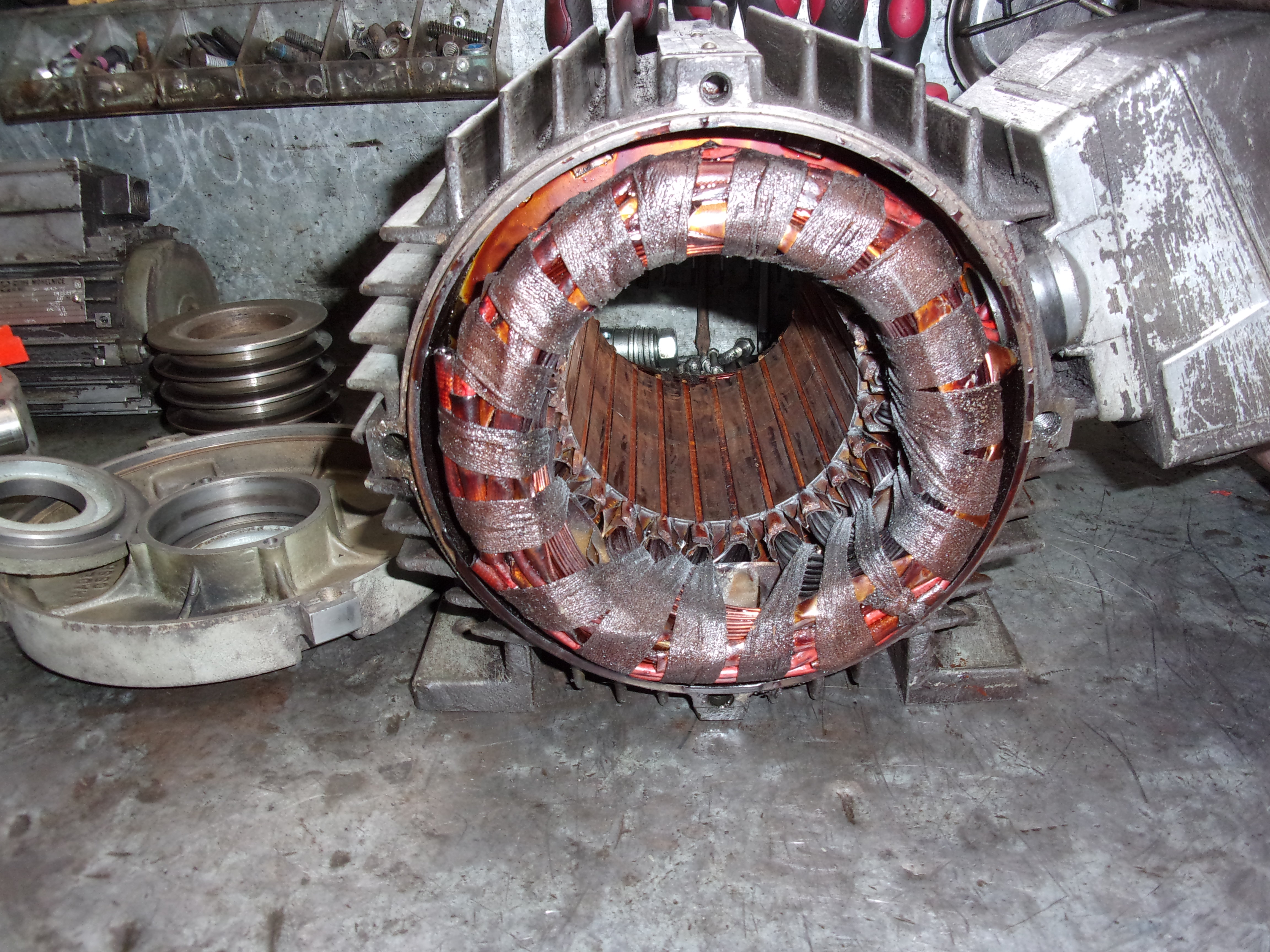 Taky pokračuji na své repasi sv18. V podstatě všude nové ložiska. Měl bych dotaz na el. motor 6kw,r.v.91, který chci používat bez ventiátoru. Žádný průraz jsem nenaměřil ale je vidět nějaké to přetížení na drátech, ten spodní obrázek. Měli jste podobné a jedete v pohodě dál? Děkuji za tip. rkr.