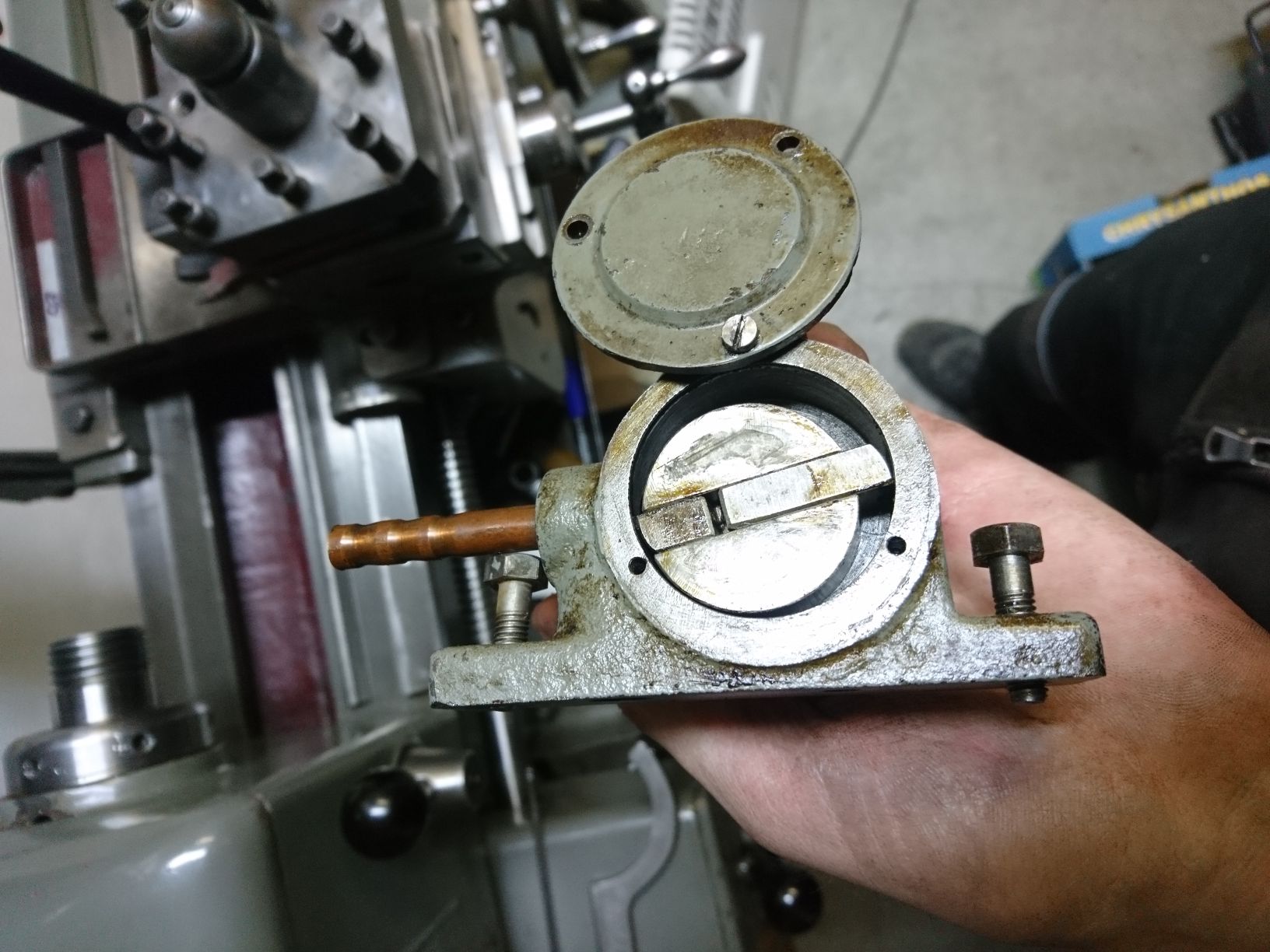 Tady jsou slíbené fotky původního čerpadla (nebo spíš pumpičky) na emulzi, které je jinak přišroubované zezadu podstavce a hnané řemenem zespod od předlohy. To mi přijde dost nepraktické, tak zvažuju že dodělám sólo pohon elektromotorem (mám tu 100W z domácí pekárny tak uvidím jestli to bude stačit) aby se dalo pohodlně zapínat chlazení a nemusel se furt nahazovat a shazovat řemen.
