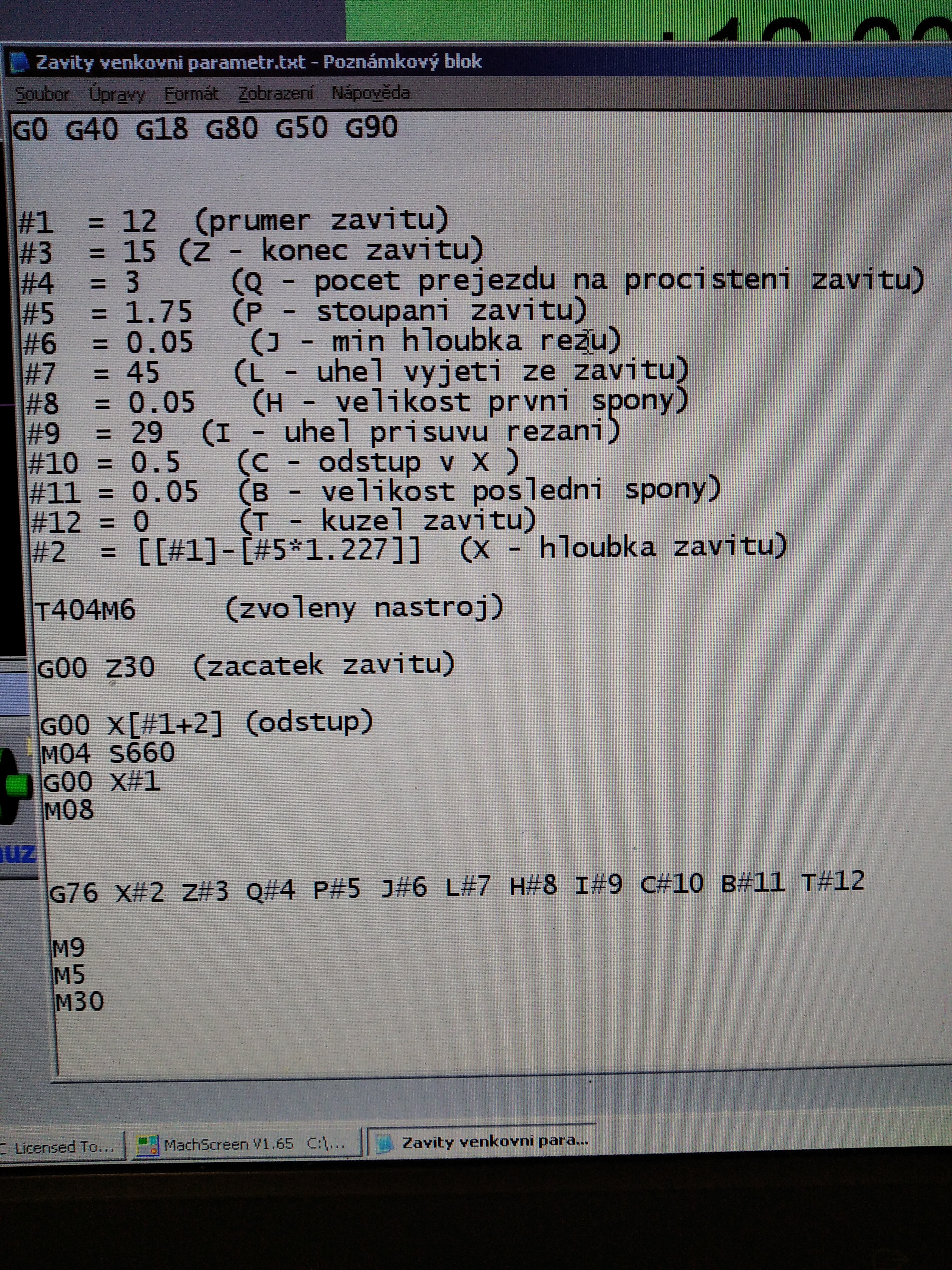 Pokud chceš tento kód používat i na vnitřní , tak pouze záměn znaménka u parametru 2 hloubka závitu a u odstupu...