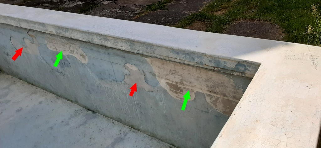 Potřebuji poradit. Mám betonový bazén. Rodiče ho zhruba před 45 lety ručně vykopali a vybetonovali. Bohužel, vydržel tak 37 let, pak ho tlaky půdy rozlámali. Praskla spodní deska, páč se pod ní udělala dutina. Taky beton nebyl moc kvalitní. Před 8 lety jsem ho chtěl zbourat, ale když jsem vzal palici do ruky, tak se mi maminka rozbrečela. No nezbylo než ho zrestourovat. Vybetonovali jsem 10 čísel základní železobetonové desky na tu starou. Pak se natáhla ipa na novou desku a starý stěny. Postavili se nové obvodové stěny ze ztraceného bednění. Na to se natáhla perlinka. Pak se udělala další vrstva podlahy a na tu se za čerstva sypal cement a uhlazoval kleťák. Pak se dodělaly stěny, omítka-klěták. No a ten kleťák na té omítce moc nedrží. Udělá se boule a odpadne. Mohli by jste mi poradit, jaká hmota by na to byla dobrá? Jedná se o tloušťku 3mm. Na fotce jsou díry označeny červenou šipkou. Zelenou šipkou jsou mnou opravené díry, které jsem opravoval před pár lety. Ty drží. Ale zaboha si nevzpomenu, jak jsem je opravoval.