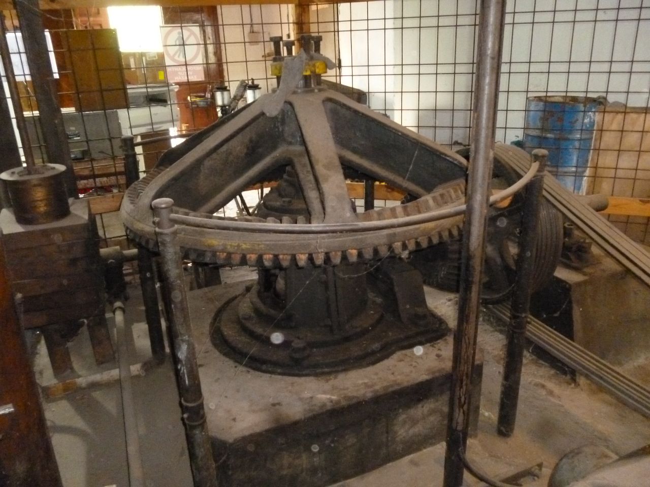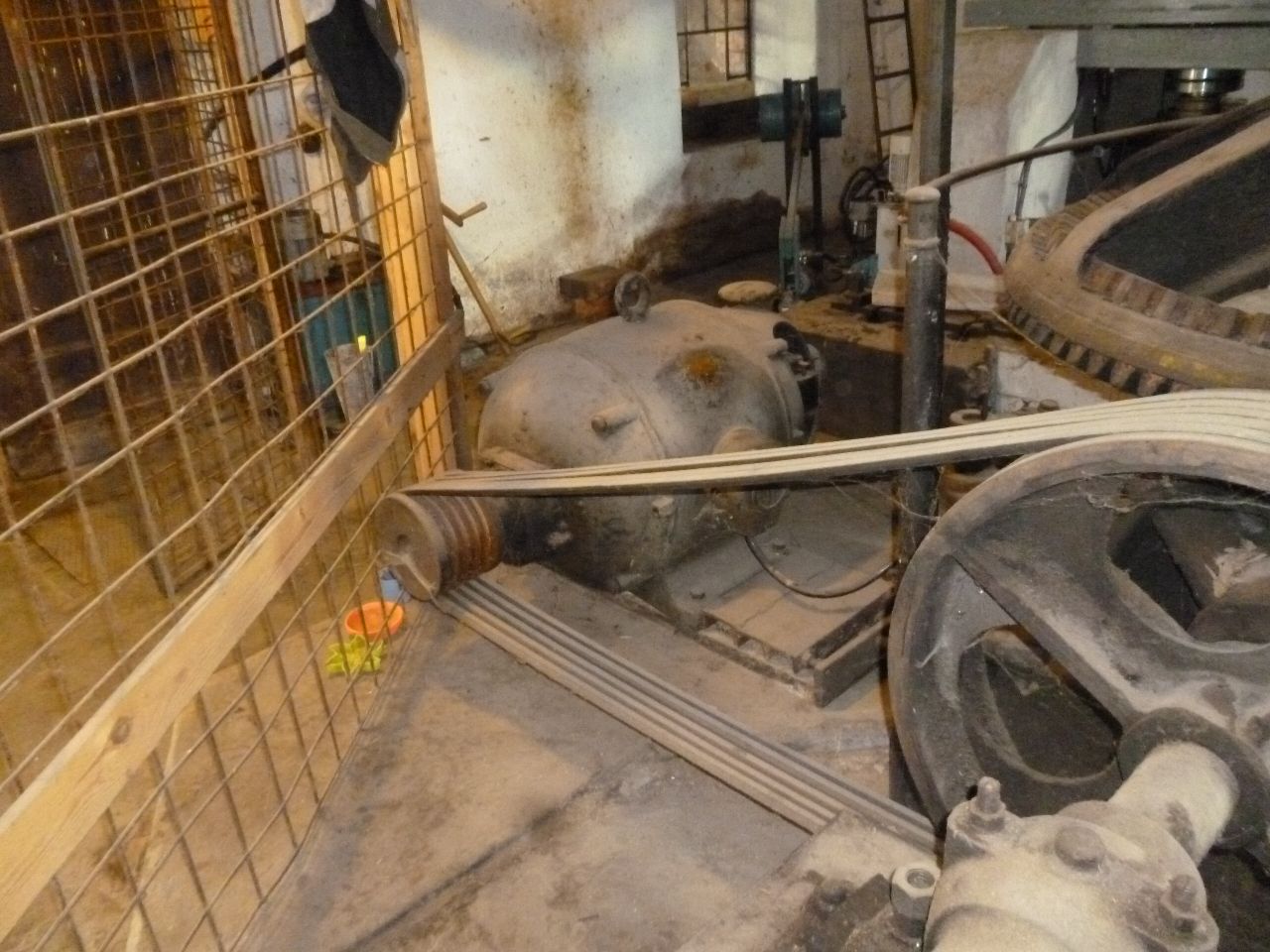 Turbínové stroje jsou dva, oba Francisy. Za mě v těch 90tkách měly obě palečné kolo a pastorek, z čehož ta menší (na fotkách má stále palečné kolo) točila generátorem (tak jak to vidíš na fotce). Ta velká (co má na fotkách nasazenou moderní převodovku od SEWu) měla tenkrát taky palečné kolo a od pastorku byl převod řemenem (kříženým kvůli změně směru točení) dolů do podpilí na transmisi průměr 80mm. Z transmise se poháněly dva katry. Bohužel v 90tých letech jeden katr havaroval, primárně kvůli trhlině v hlavní hřídeli klik. Hřídel praskla a celý katr se lidově řečeno "rozvalil". Byl to krásný předválečný stroj, neměl vůbec elektrovýzbroj, zvedání válců se provádělo ručně klikami a podávka byla odvozena od kliky systémem "ráčna".