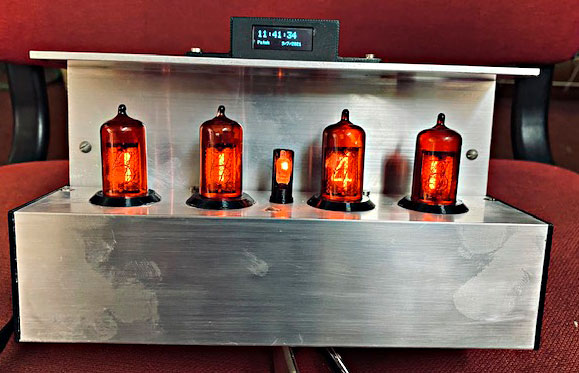 Tak jsem hodiny finalizoval, aby byl prázdný stůl. Modrý displej svítí jen 20 sekund, nebo při nastavení. Doutnavka doutná, ještě sehnat červený lak abych ji zabarvil.