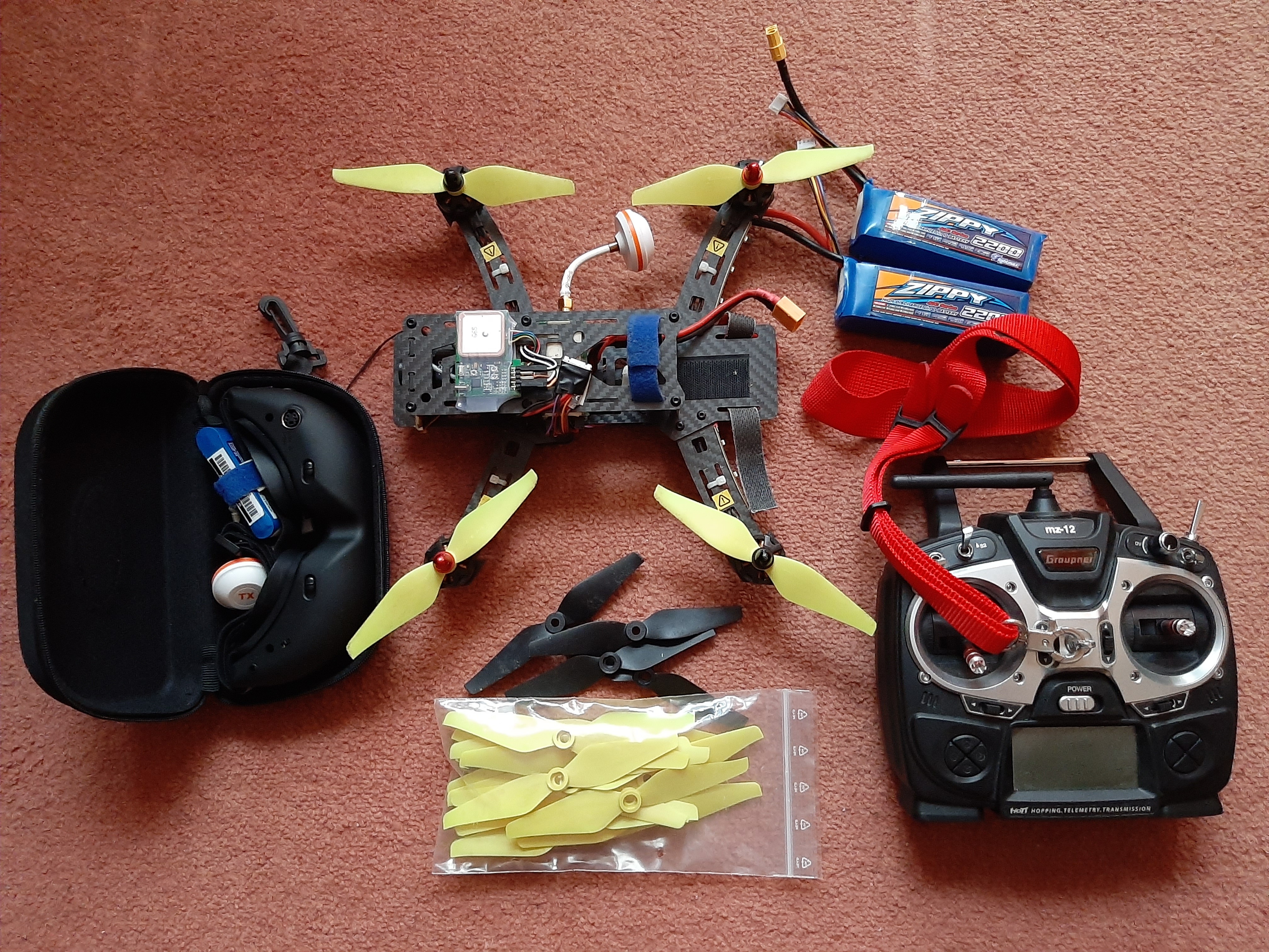 Dvě lipoly, několik sad originálních vrtulí. Dron je vybaven OSD s GPS - zobrazuje napětí baterie a polohu. Můžu ještě přihodit kabel na propojení brýlí s mobilem/pc - dá se pak video nahrávat přímo z brýlí. Vysílačka je vybavena hlasovým asistentem umí do sluchátka číst napětí atd...