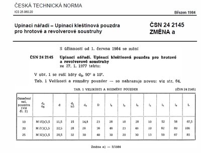 Vedel by mi niekto poradiť, čo sú klieštiny typu 16054 za štandard? Potreboval by som taký typ do vretena SM 16 B - vreteno je priamo uspôsobené na tieto klieštiny a to označenie sa uvádza priamo v manuáli (nie je tam uvedený druh normy, len to číslo). Na tomto obrázku je vidieť rez vretenom s nainštalovanou klieštinou - klieština má vzadu vonkajší závit.