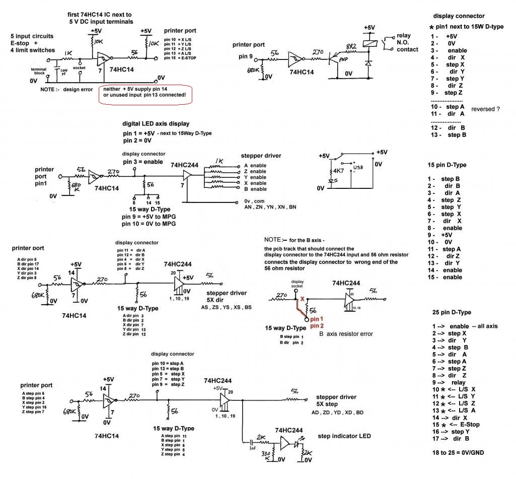 Minimalne jedno z tech 74HC14 schmitt hradel nema pripojene napajeni a pak se objevuji ruzne chyby se vstupy. Mne fungovala na jednom stroji asi 5 let bez problemu a z niceho nic prestal fungovat bud Xlim nebo Ylim vstup. Vse ostatni fungovalo dal. Myslel jsem, ze odeslo to spodni hradlo, ktere je obsluhuje. Tak jsem ho odpajel a nahodou objevil ze pin14 neni pripojeny na napajeni (+5VDC). Prislusna cesta nikam nevedla, koncila na spodni strane nepripojena. A myslim ze jeste byla nejak pofiderne pospojovana zem. Fakt, ze to mohlo fungovat i bez patricneho napajeni a navic tak dlouho je napul zazrak. Myslim ze dalsi dve hradla byla uz pripojena. Ale byt tebou, tak to zkontroluju jestli tu desku chces jeste nekde pouzivat.