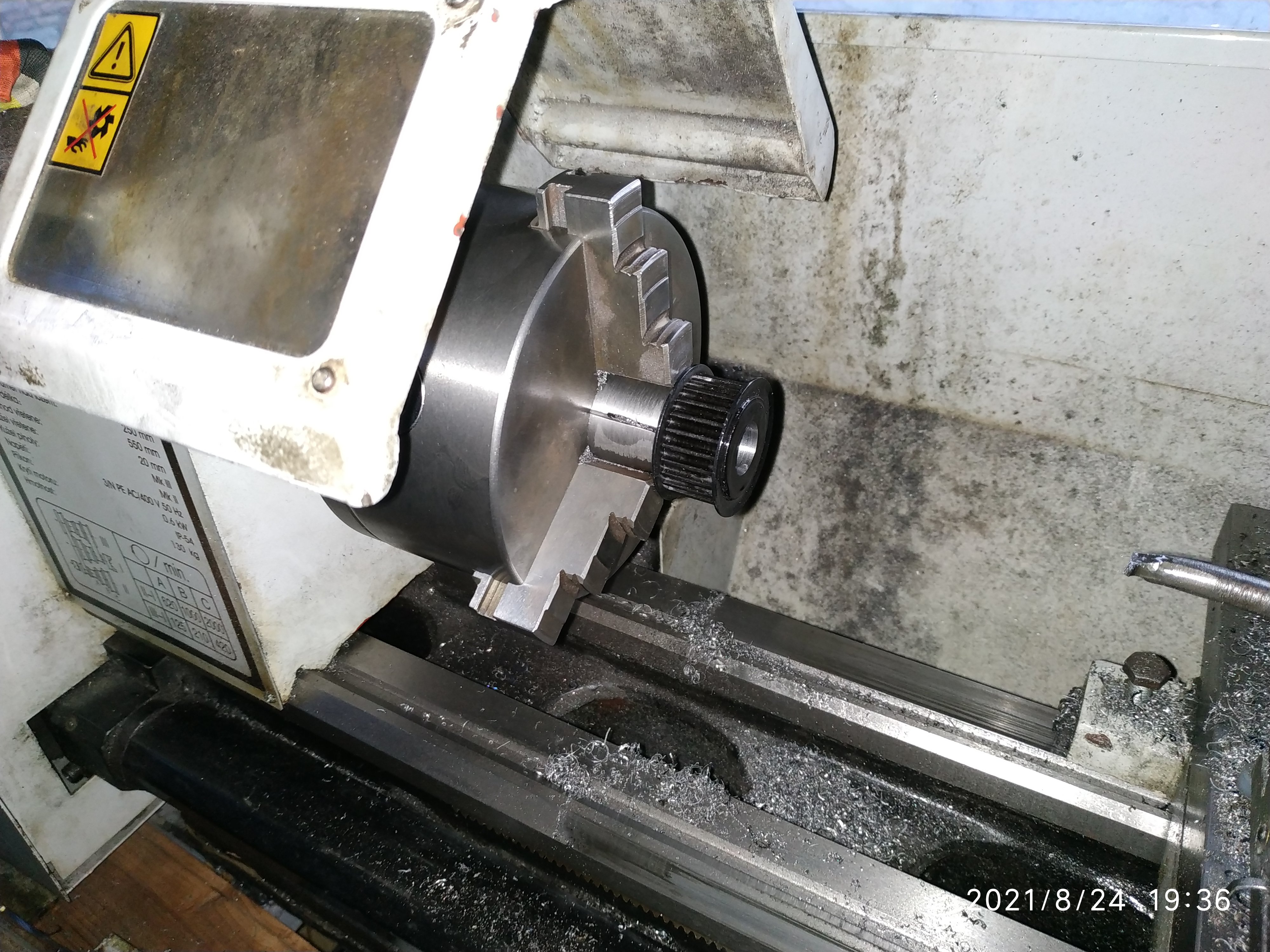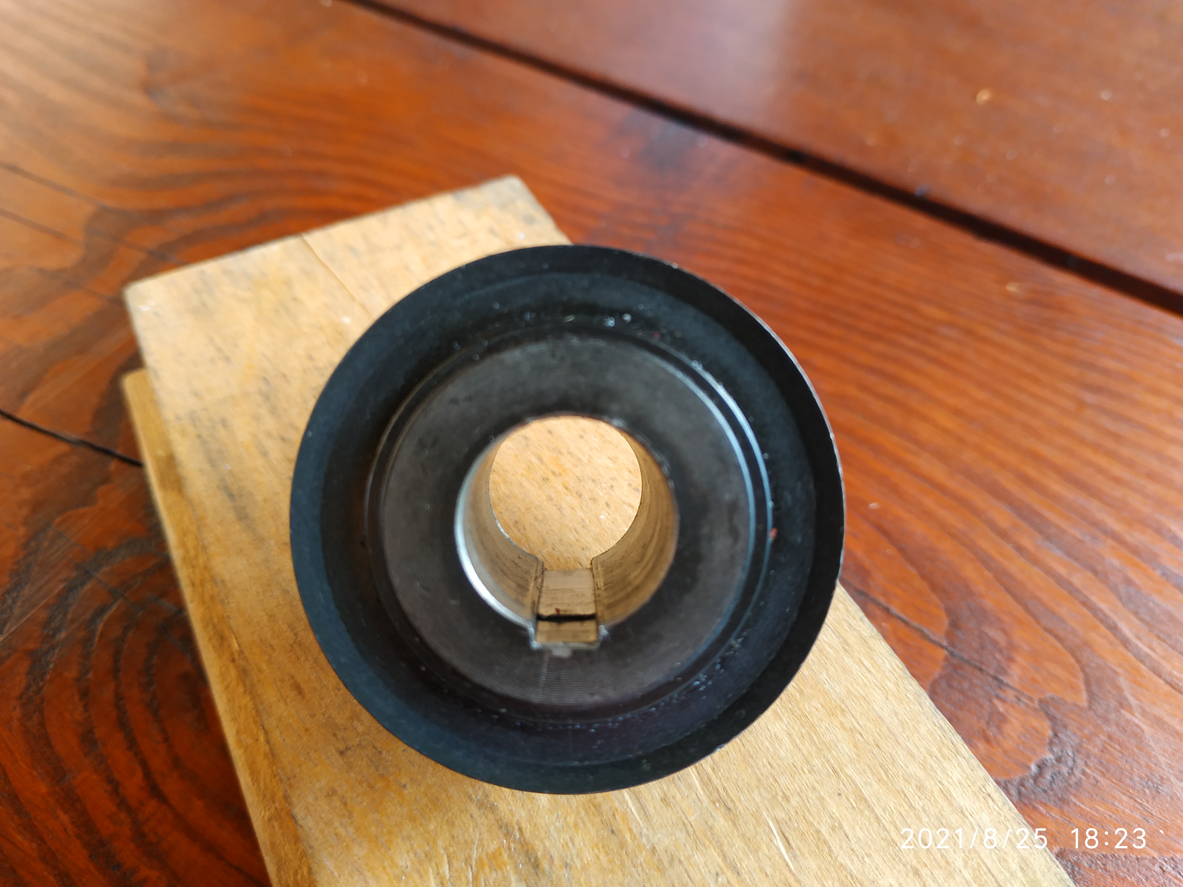 Vybral som si spôsob jednorazová klieština. Stočil kus rúrky narezal po 180° ako má klieština. Potom upnul do univerzály, stočil vnútorny priemer na rozmer osadenia remenice, na záver prerezal do konca drážky z jednej strany, nasadil remenicu, zmeral hadzavosť keď som sa dostal na požadovanú hadzavosť, dotiahol na plno a začal vŕtať a potom z vnútornim nožom zväčšil na požadovany priemer.