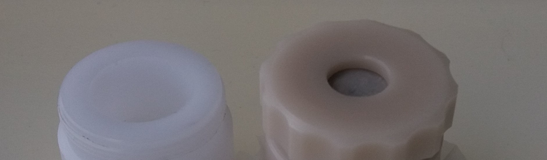 Zde je barevná změna do hněda u POM-C po radiační sterilizaci. Záření gama, dávka 25 kGy. Kus vlevo nebyl ozářen. Docela mne ta změna překvapila. Jak se mění mechanické vlastnosti netuším. Například PP a PE silně křehnou.