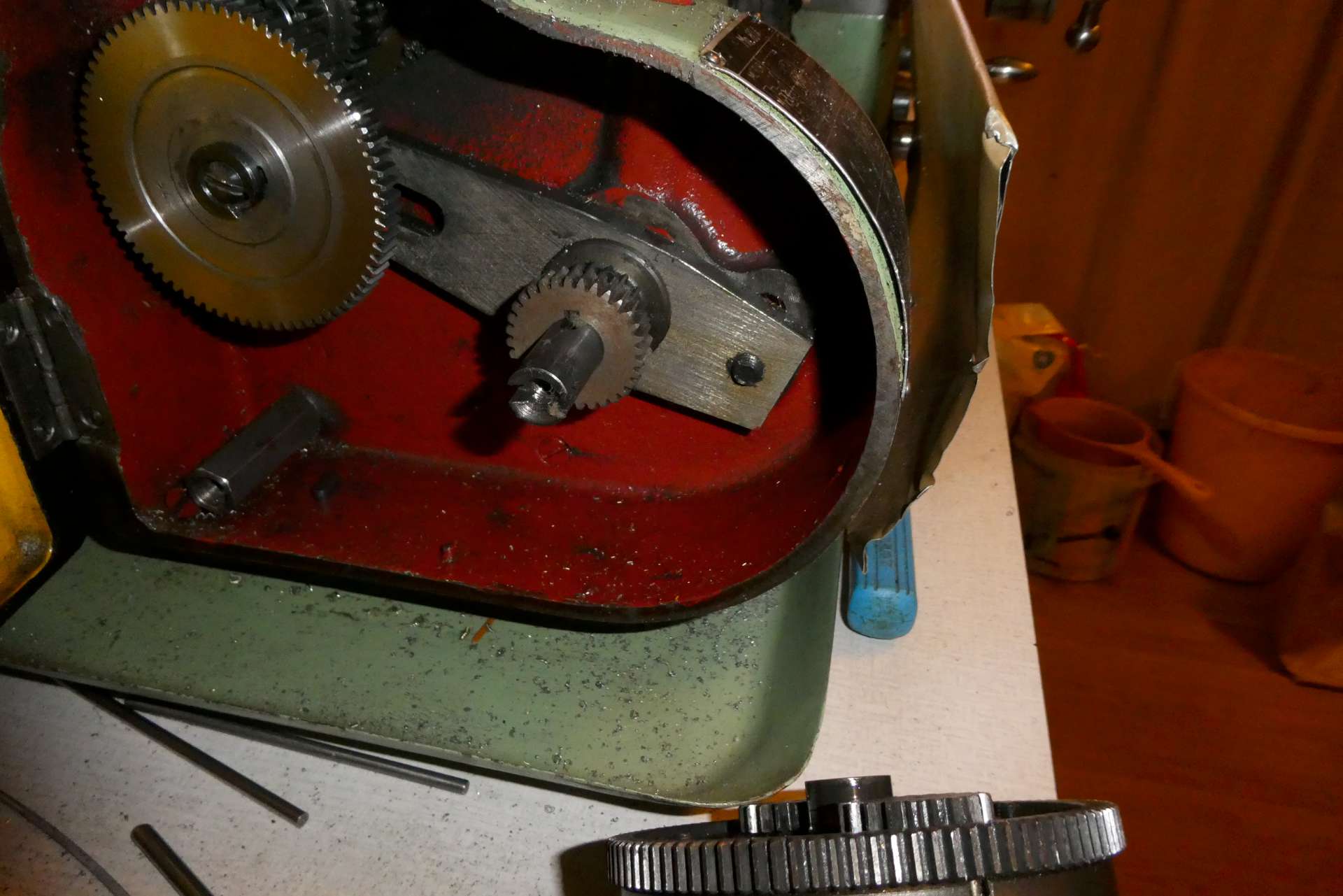 Podle mne Vám tam chybí pevný pastorek pro diferenciál a proto kolo D dosedá až ke skříni a není v rovině ostatních kol převodu. Asi by se to dalo řešit podložením jednoho právě nepoužívaného kola směrem ke skříni. Diferenciál je tam nutný pro podélné posuvy při soustružení. Ten Vám možná vůbec chybí.Obrázek