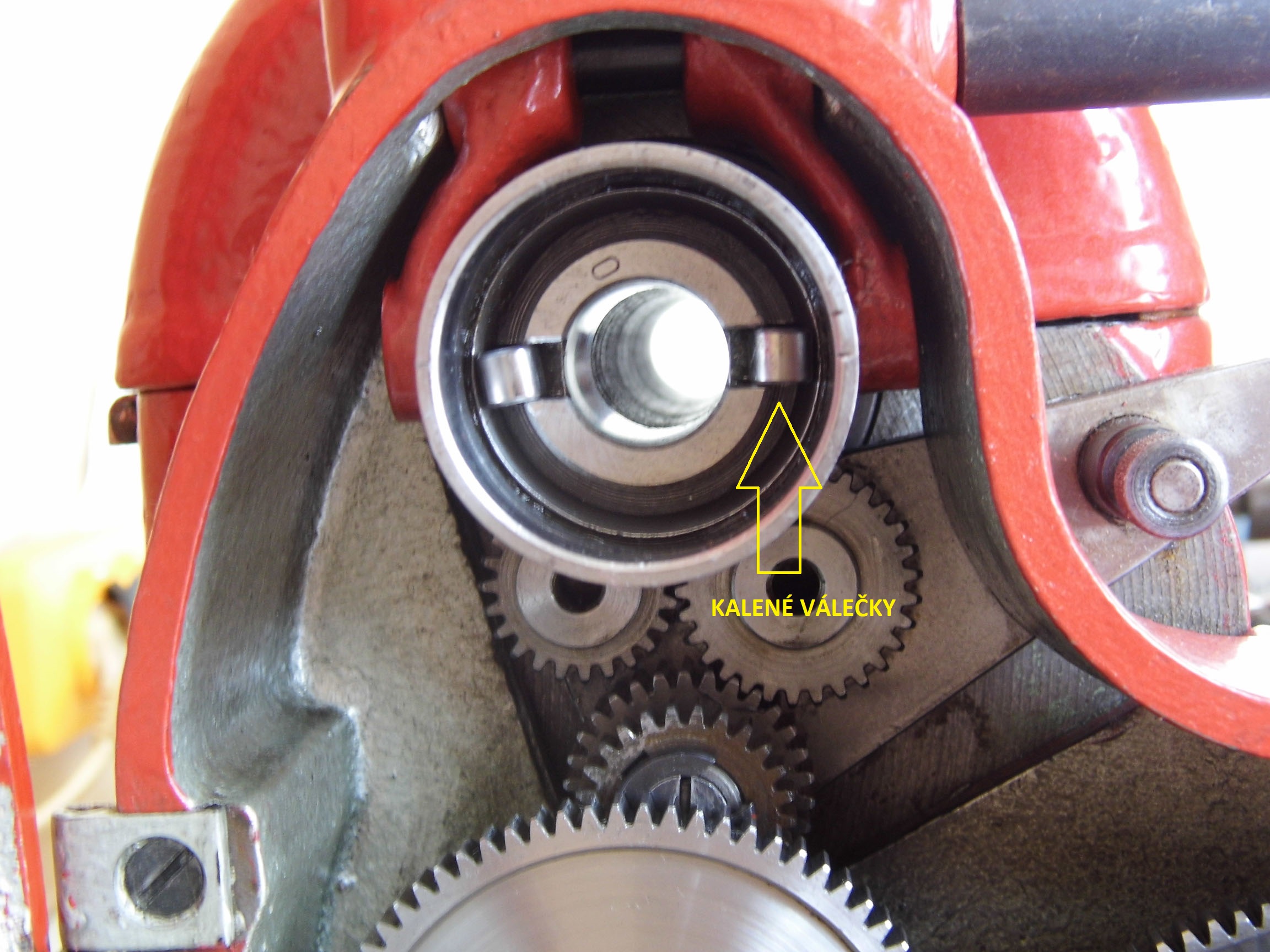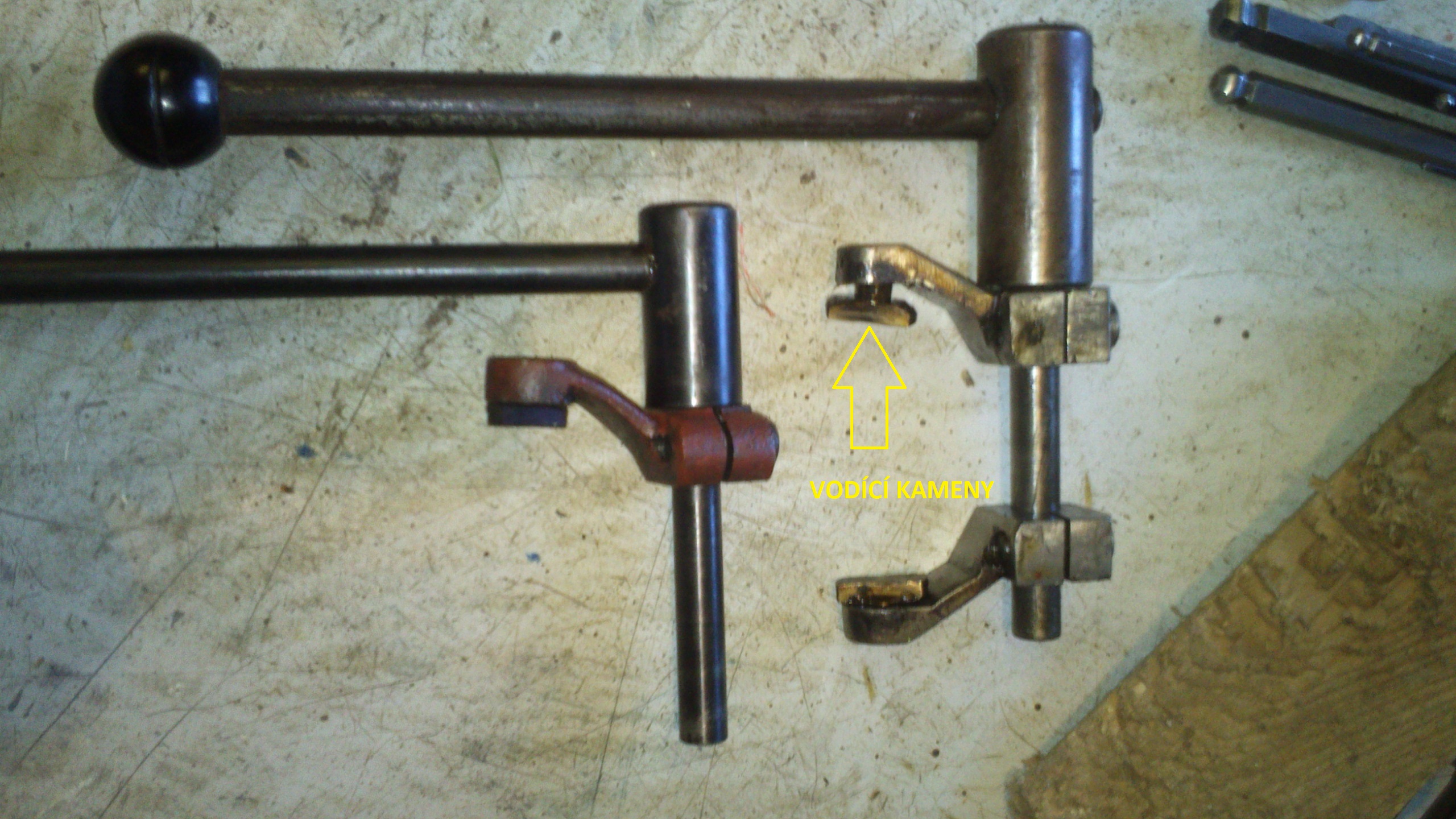 Na zadní straně vřetena je nasunuté jakési "unášecí pouzdro", které má uvnitř drážku na pero. Pouzdro se musí pohybovat v axiálním směru lehce a bez drhnutí. Na obvodu má tohle pouzdro zápich pro dva vodící kameny, které jsou spojené s vidličkama té páky a umožňují posouvání onoho pouzdra. Uvnitř pouzdra jsou ještě poté nasazeny (klidně pomocí vazelíny) dva kalené válečky odvalující pohyb upínací páky při uvolňování a utahování obrobku.