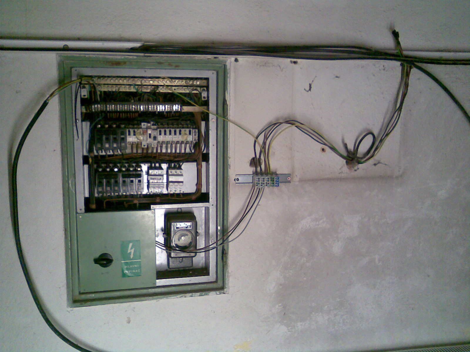 Z té HDSky to vede dovnitř do tohoto zeleného rozvaděče kabelem, za hl. vypínačem jde část přímo na jističe a část mimo rozvaděč za premix desku na podružný elměr č.1, z něj se zase vrací do tohoto zeleného rozvaděče, ale na jinou část jističů.