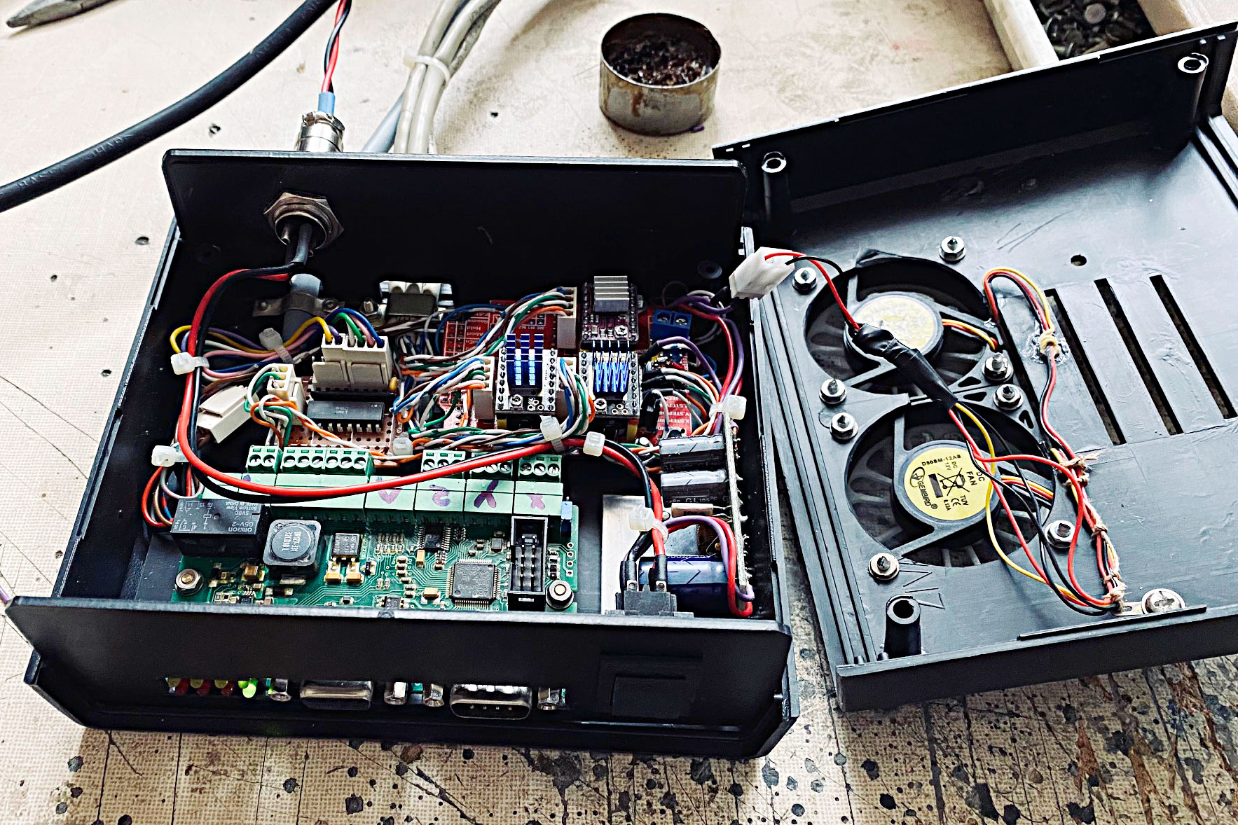 Původní strojek jasně ukázal, že zvolené podepřené tyče jsou cestou do pekel. A protože jsem tam měl i několik designových problémků, rozhodnul jsem se k radikálnímu řezu. Lineáry, kuličkáče a pohyblivej portál. Na osu X jsem dal silnější motor (přesněji nejsilnější NEMA17), drivery zůstaly stejné a řízení Gravos taky. Protože jsem se snažil použít maximální množství původních dílů, jsou někde díry navíc, ale hlavně pod pohyblivým portálem není místo na elektroniku a tak šla vedle do krabičky. Pro drivery jsem místo původního tiskárnového použil klasický UNO shield, kterému jsem vypreparoval zbytečnosti. Malá destička u Gravosí desky je pouze galvanické oddělení referencí. Dva větráčky nejsou potřeba, ale při napájení 27V bych musel řešit ještě napáječku 12V a tak jsou větráky v sérii a pohoda.