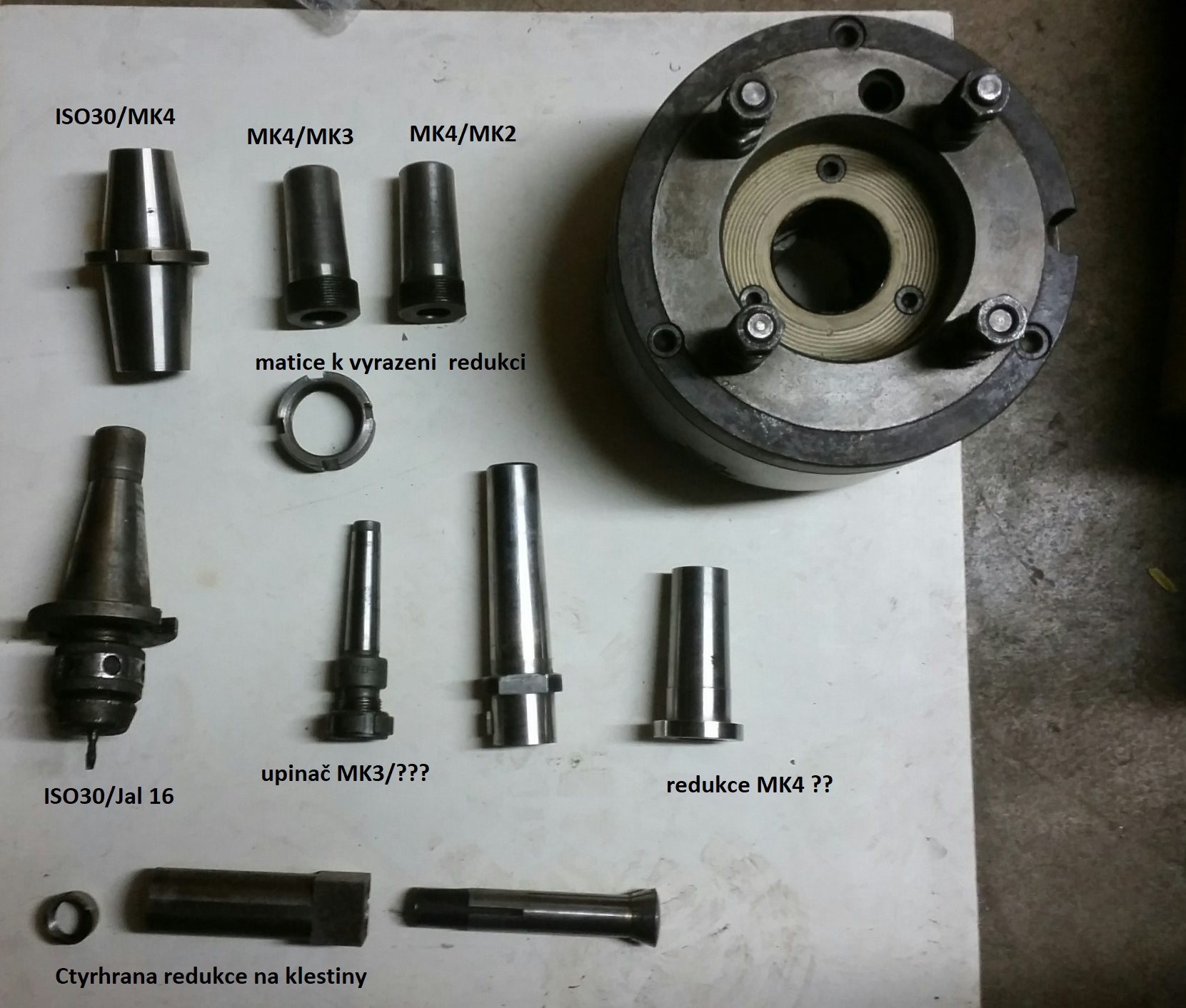 To souhlasí,až na ,,tyto" kleštiny, a ,,jediný vtahovací trn".To je jen krátký závitový čep,z jedné strany se závitem tuším M22X1,5 ( prostě jako na všech držácích nástrojů k téhle frézce se strmým kuželem) a z druhé se závitem podle té kleštiny.A logicky není jediný,protože ty kleštiny se používají i v děličce,takže min 2ks..