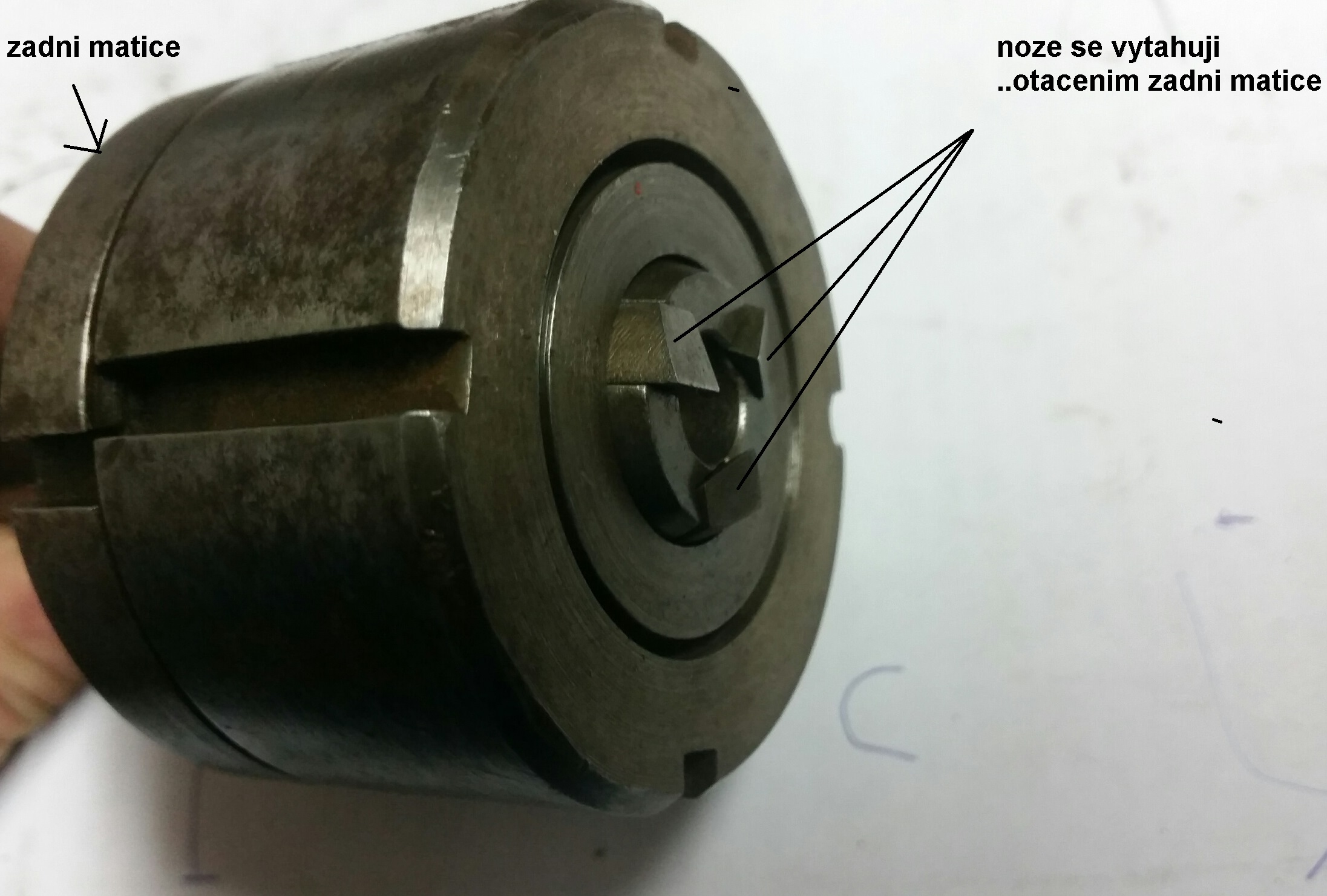 Jo tak tobude ono na výrobu dřevěných tyček, kdyby to byl unašecí hrot tak to neleze ven při utahování matice, ale bylo by to buď v nějaké pružné hmotě, aby se to usadilo a netáhlo na jednu stranu mezi hrotama když se to pak upne za trochu nerovný čelo.
