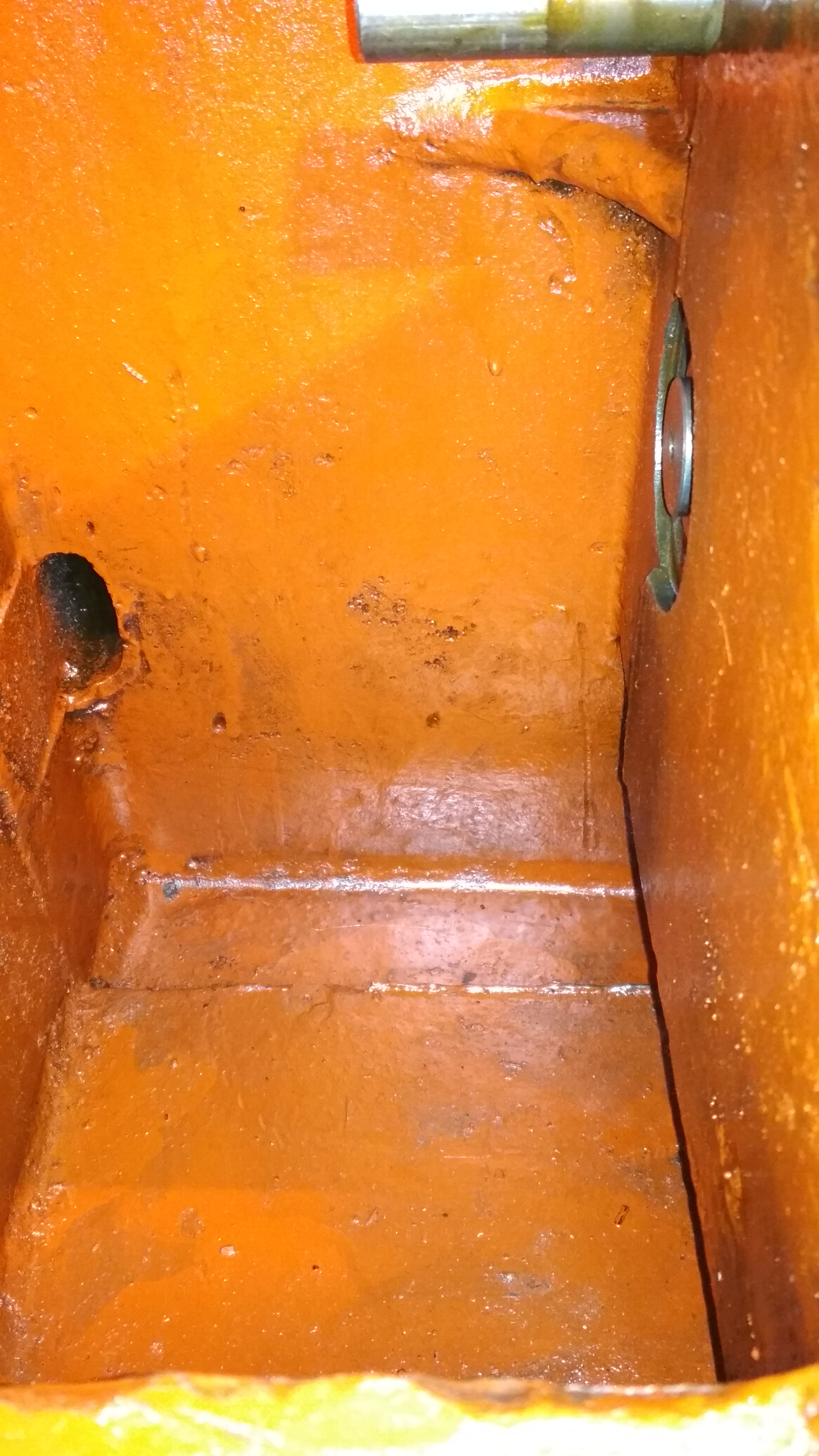 Obr. 16: Boční dírou se vpraví nálplň oleje. V návodu k S-28 uvádějí, že do suportové skříně se vejde 1 kg oleje; já tam odměřil 750 ml tak, aby olej byl v polovině výšky olejoznaku.