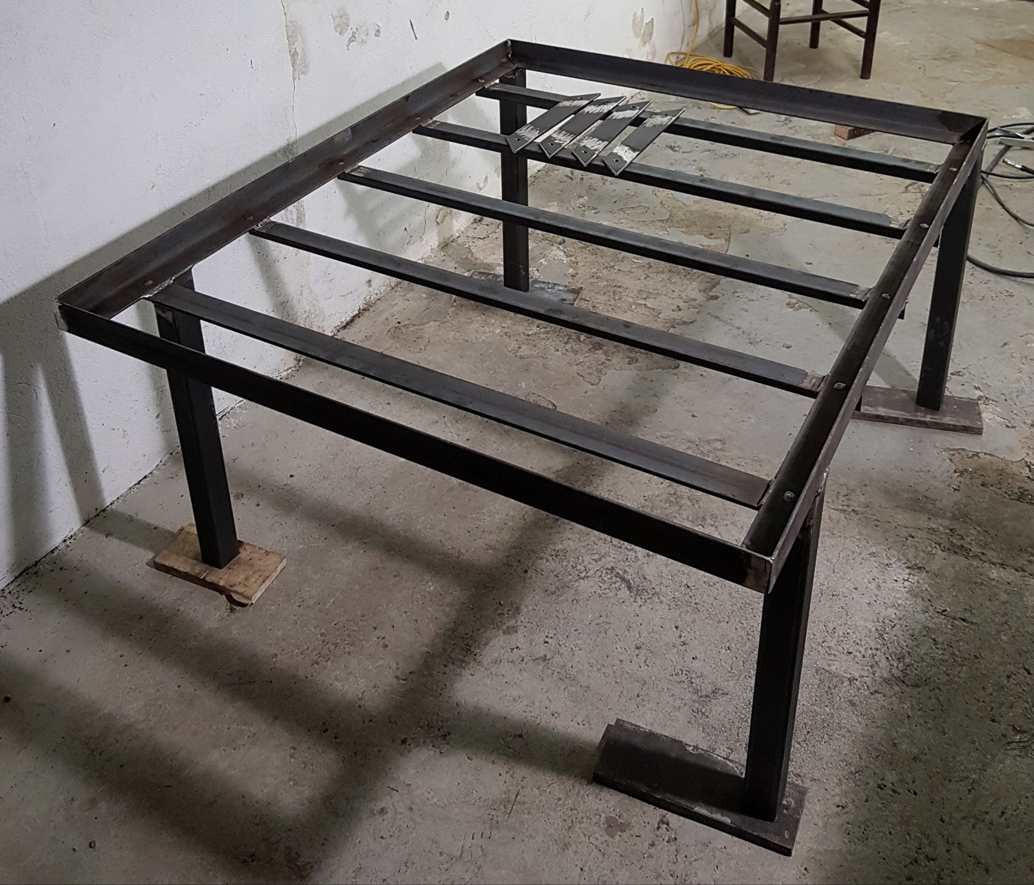 při výšce nohou 60 cm by stačilo udělat v rozích výstuhy (vzpěry) z L třeba 40x40 délce tak 30 cm (30 cm přepona budoucího trojúhelníku), ke každé noze 2, tj. 8 celkem