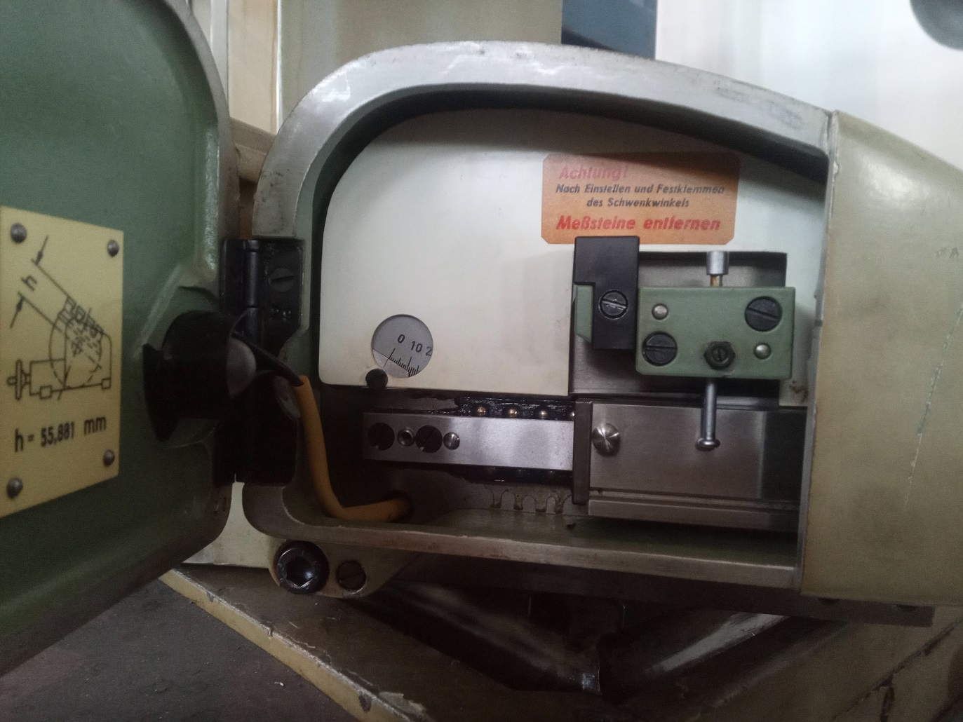 jergus.balaz píše: 10. 4. 2022, 8:07 Je to otočný stôl k suradnicovej vyvrtavacke WMW Mikromat Dresden, typ BKoE 400x630, v našich končinách hojne rozšírené. Založil si johansonku, tuším 50tku, hore indikátor a ten si nastavil na 0. Na základe požadovaného uhla si vyrátal dĺžku johansonky, tu si založil a nastavil uhol na indikátor na 0. V podstate "sinusova" metóda.
