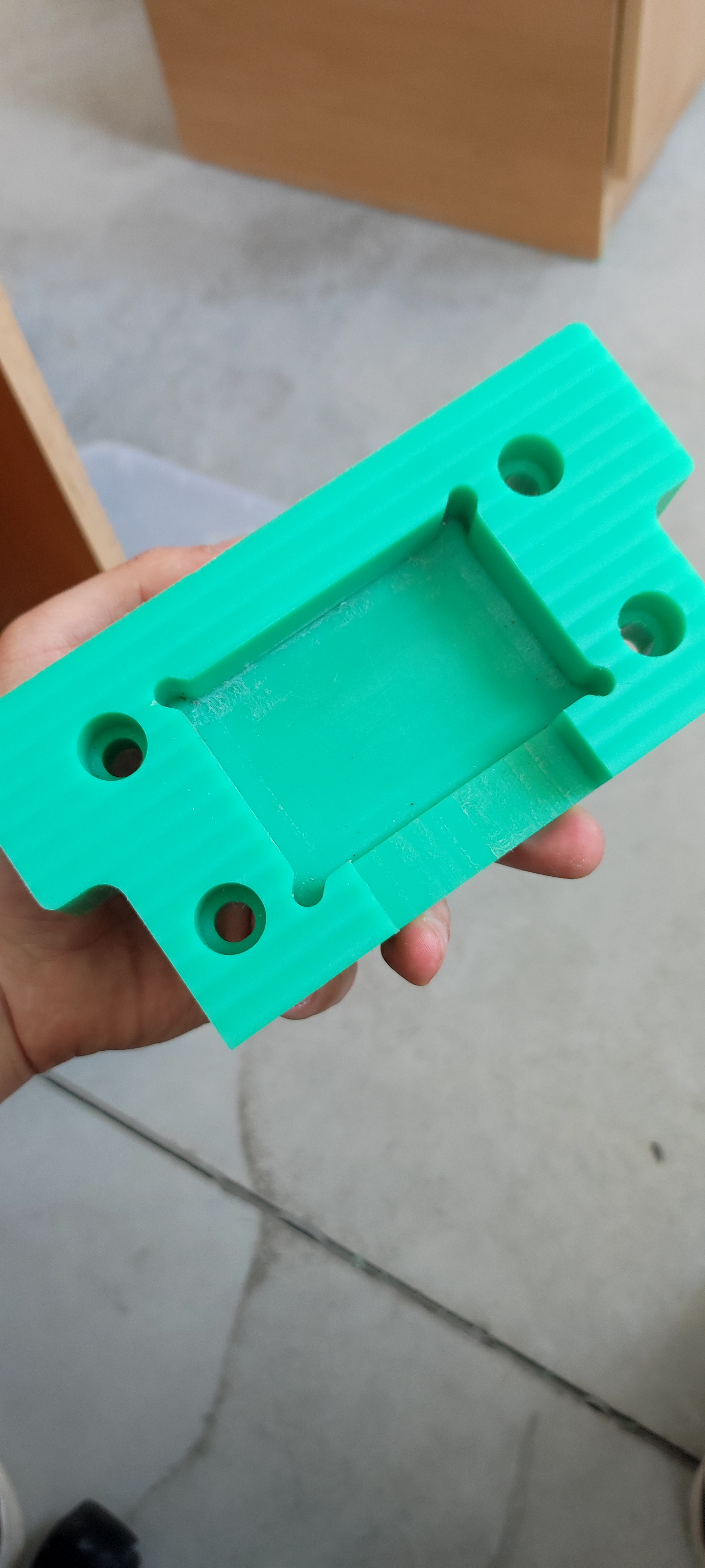 Mne sa podarilo nieco taketo nakoniec.. Ten vrch má pekny povrch .. to som frezoval iba do jednej strany ( z prava do lava ) . Ale to vnútro tam je problém , že ten plast robí niečo také čo možeš vidiet na foto.. používam jednobritú frézu neviem možno to je tým. Vidim že to aj chladiš niečim , takú možnosť ja nemam.