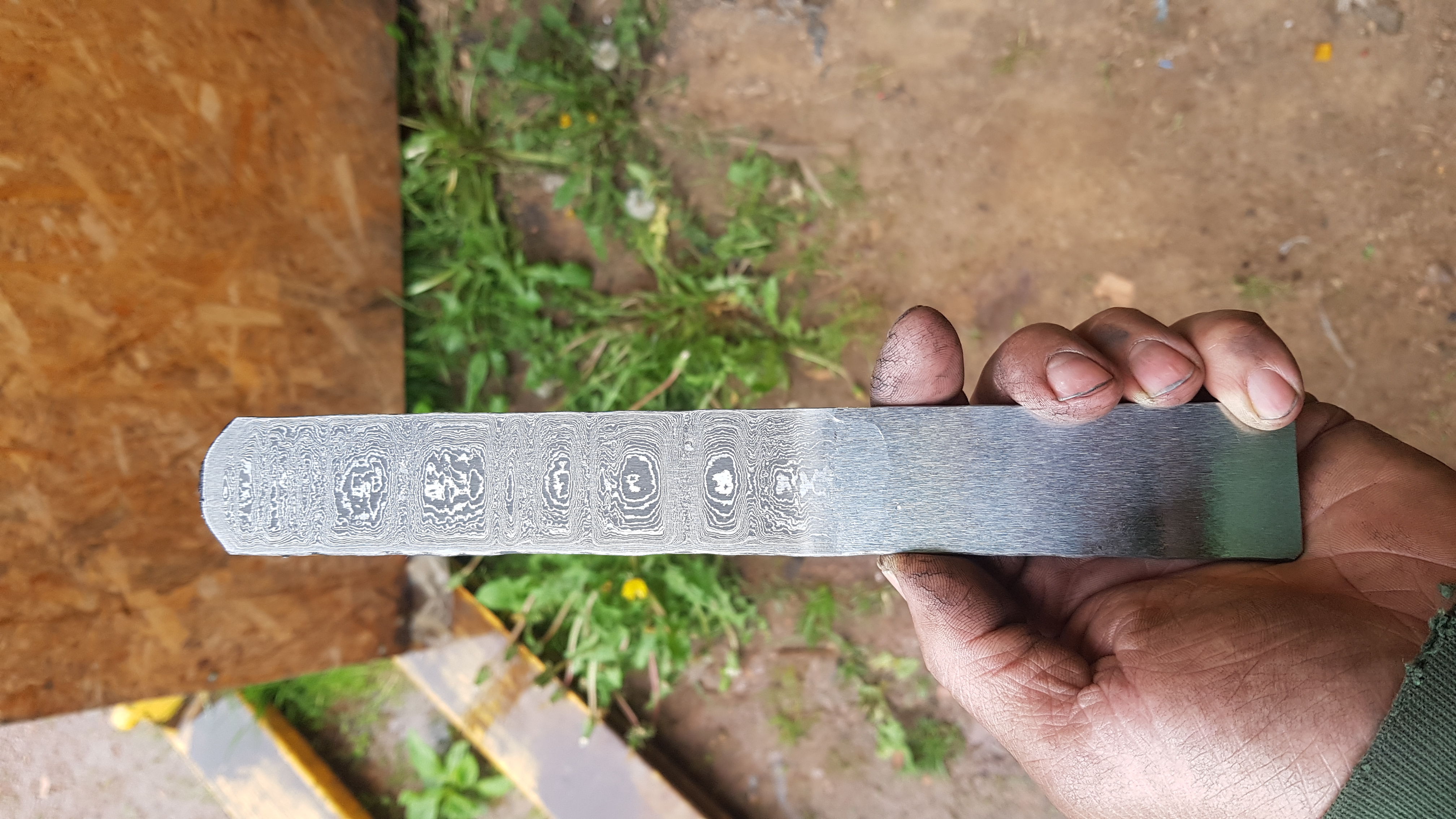 jen pro ukázku co je 36 grit Cubitron II, kovaný polotovar damašku a výsledný produkt který putuje dále do sveta