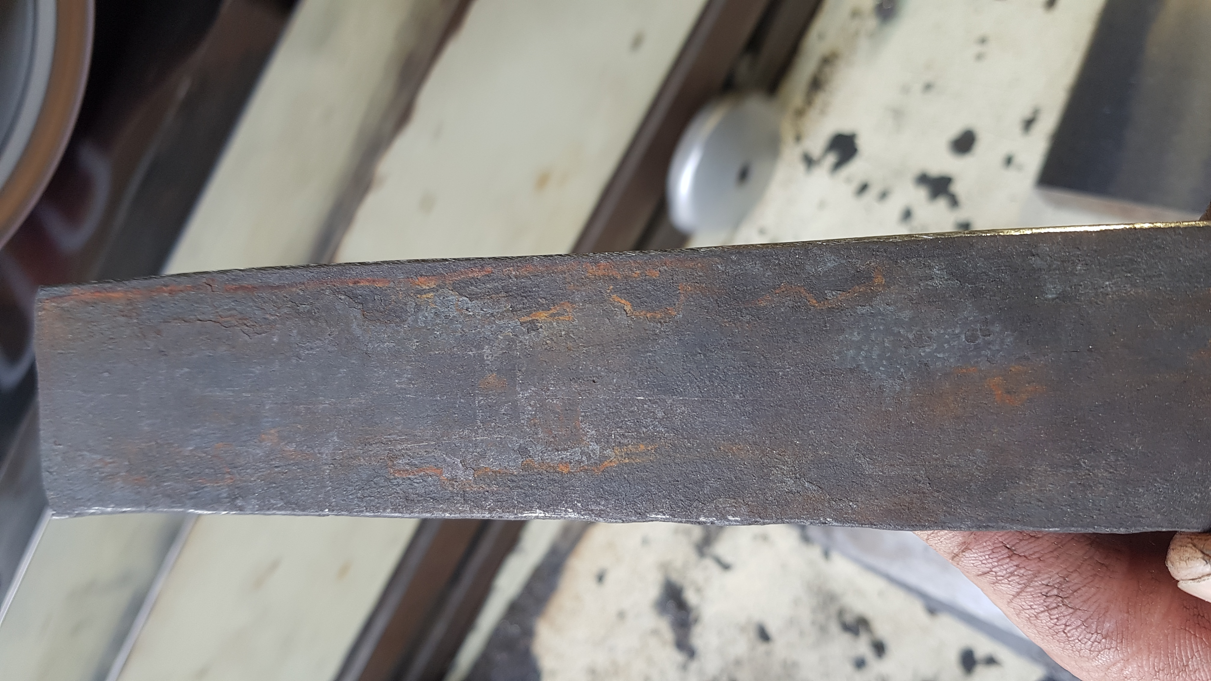 jen pro ukázku co je 36 grit Cubitron II, kovaný polotovar damašku a výsledný produkt který putuje dále do sveta