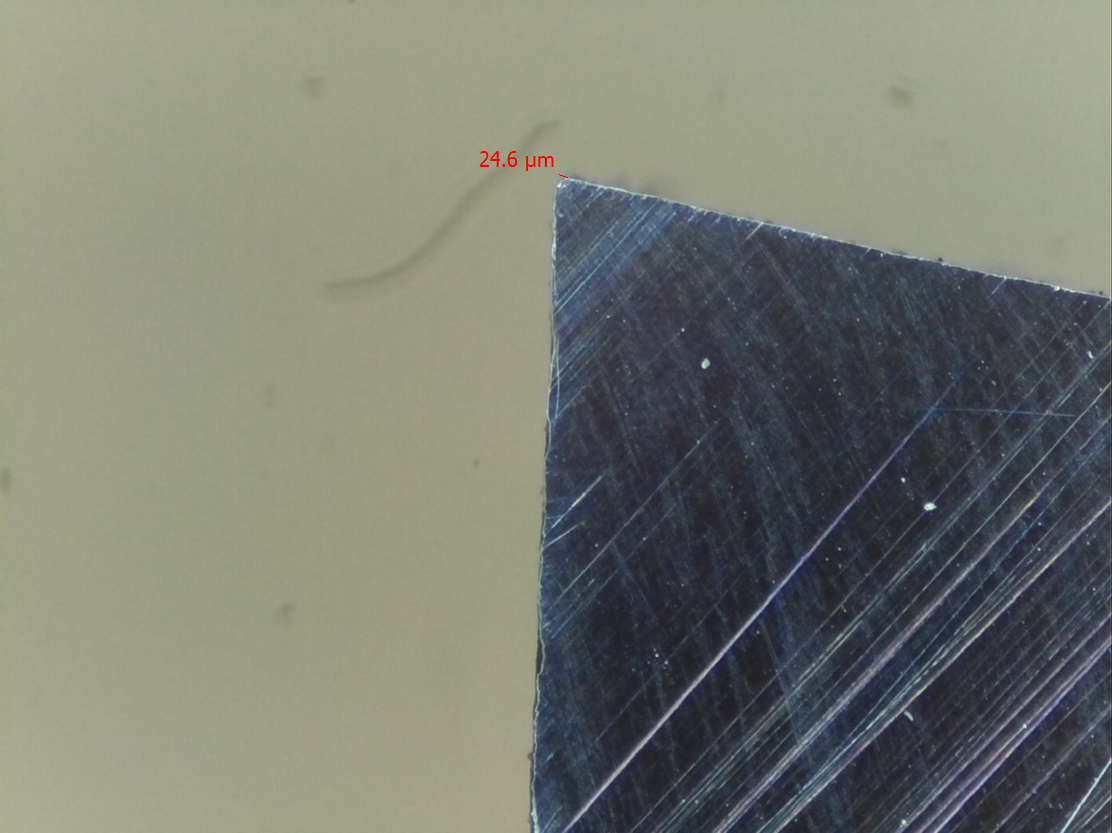 Je vidět, že jednak povlak moc nedrží, ale hlavně se není čeho chytit s měřením (vadí zbytky utvařeče), takže radius je "tak nějak" (snažil jsem se pod tři stovky).