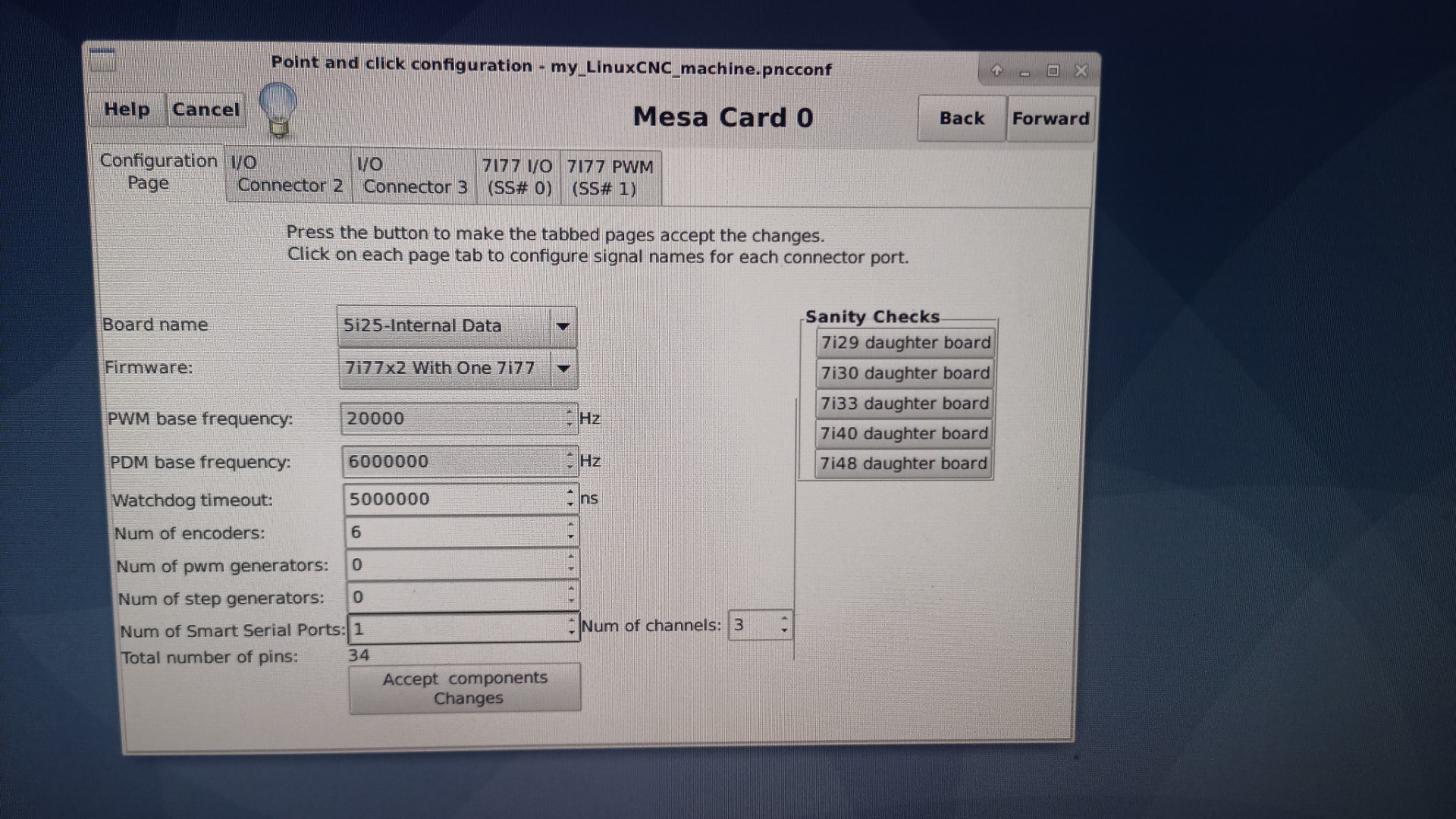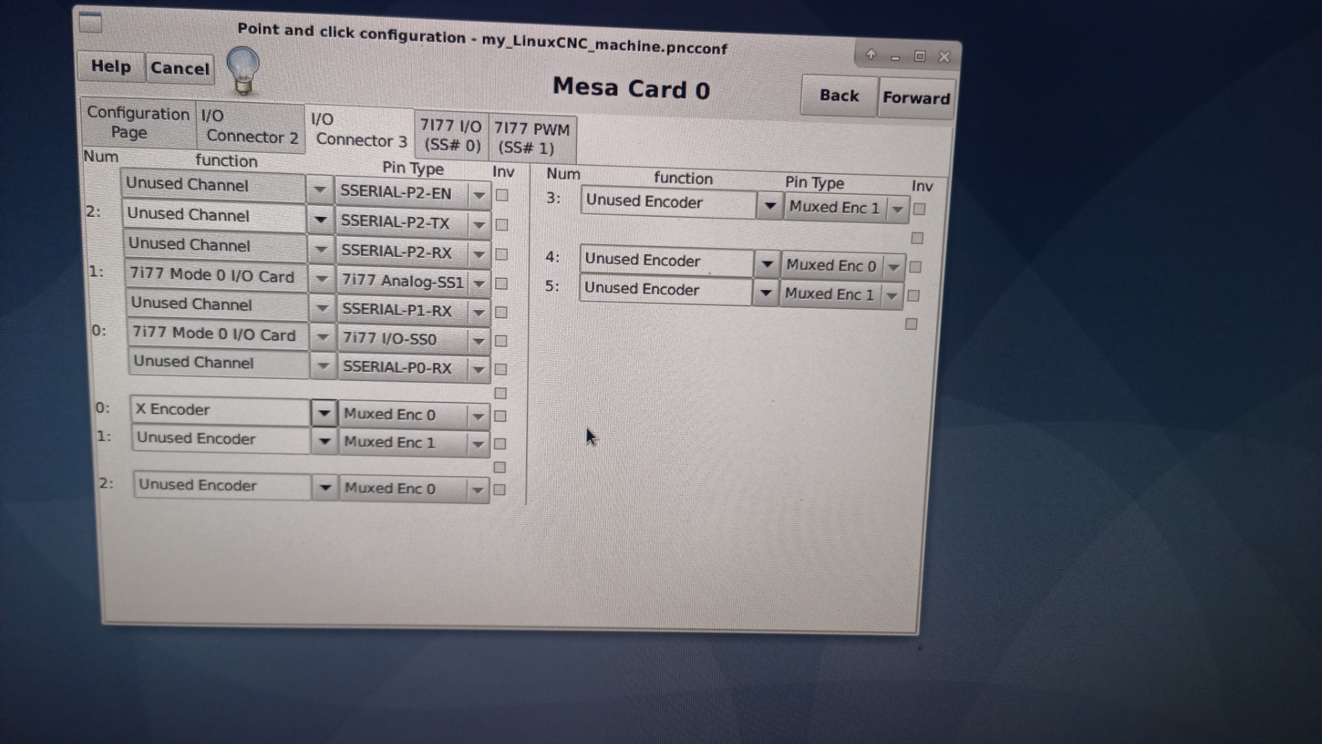 Teď jsem se zasekl na tom že když spustím pncconf tak když si zvolím svoji 5i25 a 7i77 tak mi to nalezne pouze "jednopinové" enkodéry, ale příjde mi že když jsem si s tím hrál před 14 dny tak jsem tam měl sólo záložku kde byly jenom enkodéry a šli ke každému přiřadit A+,A-,B+,B-.. a tak podobně.