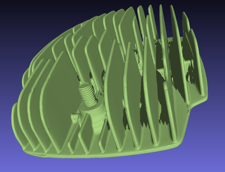 Pri výbere skeneru som na skúšku používal(ak sa dalo) hlavu valca z ČZ175 a konečne som mal čas urobiť skúšku toho ako to zvládne tento skener. Rebrovanie je celkom komplikovaná vec, ale hlavne som bol zvedavý, či budem vidieť poškodenie od prílišného dotiahnutia matíc. Výsledok je uspokojivý. Skener síce nevidí úplne všade, ale na reverz do CADu je to ok.