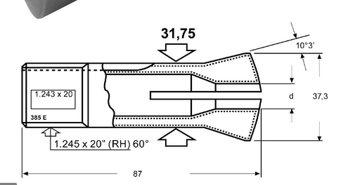 Závit 79/64" (tedy 31,35 mm) se stoupáním 20závitů/palec (tedy 1,27 mm).