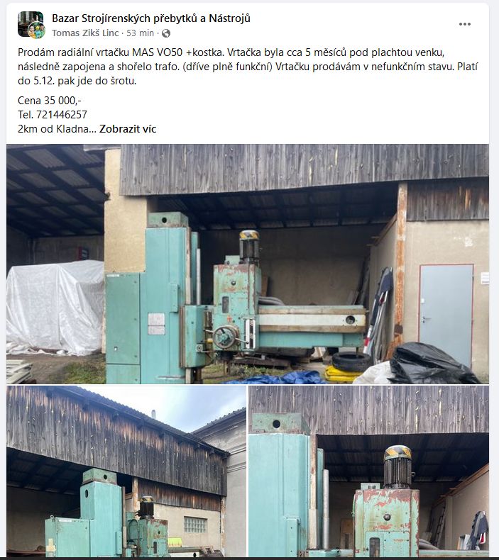 To jsou přesně ty důvody proč by se mi moc líbila, u mojí VR2 už to tak snadné není, než se vše zabrzdí pákama, tak to mnohdy "ujede".kenybz píše: ↑24. 11. 2022, 4:47 tvl VO50-ka na té jsem vrtal ve škole hoši když je ta vrtačka vyvážená, tak po odbrždění tlačítkem ve středu "kormidla" stačí lehce šťouchnout do ramena a celá ta vrtačka se otáčí jak kdyby to vážilo pár deka. Výborně se tak najíždělo na střed díry do vřetena se dal hrot, najels, pak zmáčknout tlačítko a všechno se zaaretovalo prostě paráda. No ale co dneska s ní?