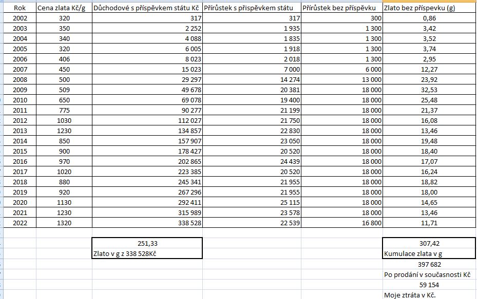 Jestli máte penzijní fond jako já, tak tady máte něco k zamyšlení. Kdybych za ty částky, co tam od roku 2002 posílám, každoročně si nakoupil zlato, tak mám dnes 307g zlata. Počítám s 8% ztrátou při nákupu, páč jsou to malé objemy. Těchto 307g zlata bych byl schopen prodat 2% ztrátou a utržil částku 397000Kč. Kdyby mi dnes vyplatili to penzijko, tak si za to budu moci nakoupit jen 251g zlata. Suma sumárum, mohl jsem si naspořit 59 000Kč více i bez státních příspěvků. Ovšem, kdyby to takhle dělali všichni, tak cena zlata bude taky jinde. :D