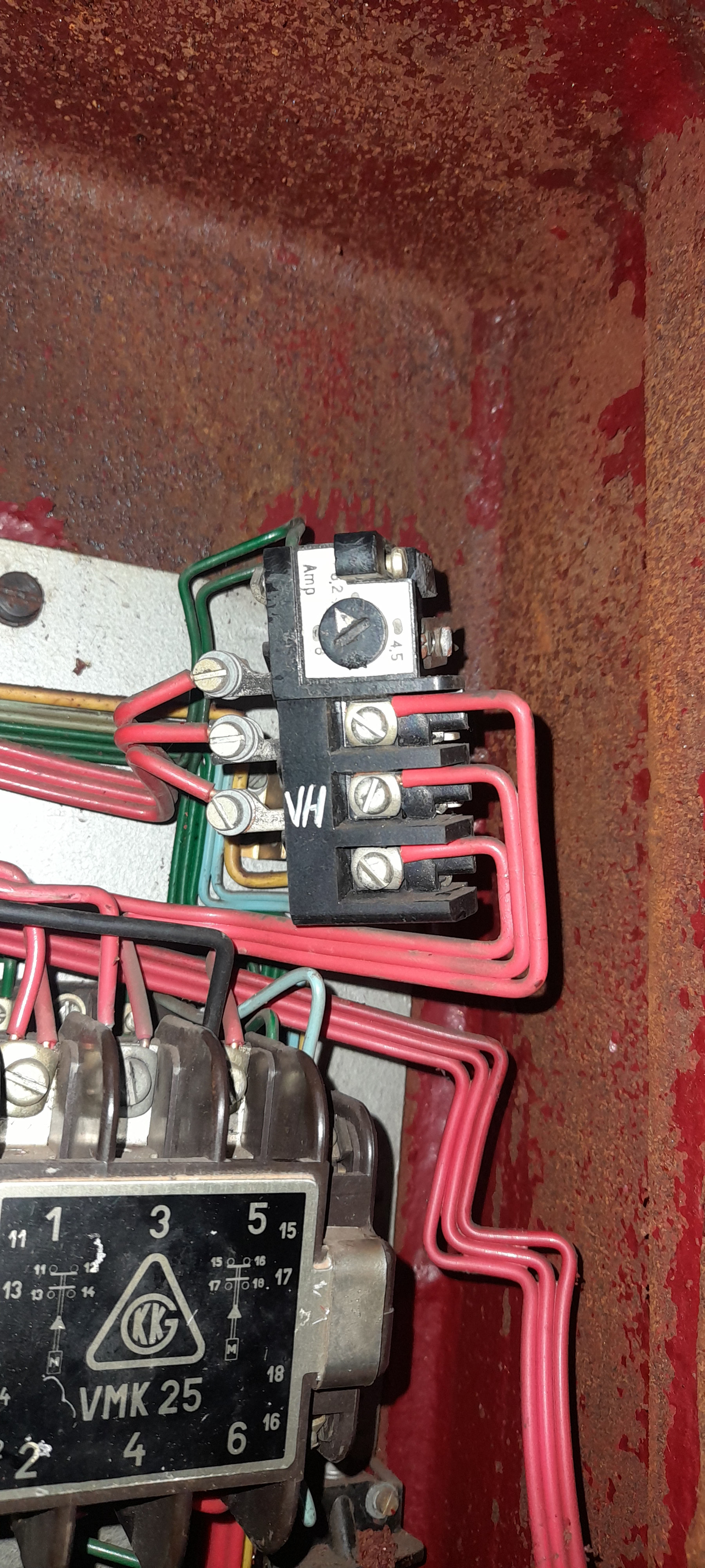 Frézka ME250 má dle schématu ovládací napětí 36V AC. Je to trochu neobvyklé napětí ale např. třeba Schneider electric cívky stykačů pro toto napětí vyrábí. Stykač KAJ je jedním z reverační kombinace pro motor posuvu, ten má výkon 1,5 kW.