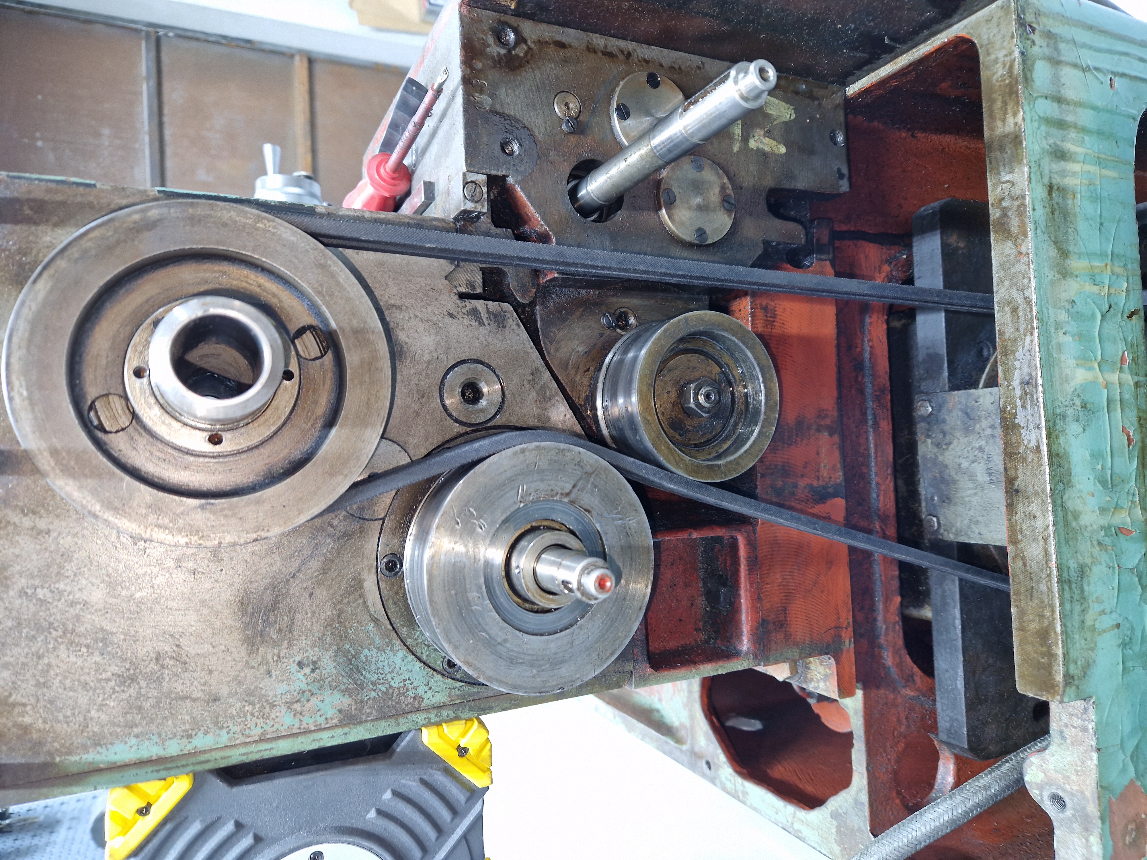 Aktualizace: tak je to skutecne bastl. Z te vetsi kladky byla odstranena remenice a ta mensi kladka je dodelana. Ma tam by skutecne remenice s prumerem 110mm. Nekdo usetril 1 remen. Vymena remene neni uplne nejjdnodussi a tak je mi asi jasne, proc to tak nekdo udelal. To by nemuselo byt uplne spatne, pokud by prave ta mensi kladka neprokluzovala obzvlast u pricneho automatickeho posuvu. Je stesti, ze kdyz jsem pred rokem sehnal za bednu dilu z jine 16ky, tak tam byla i puvodni kladka a chybejici remenice. Takze dily mam. Uz jenom nejak setrne sundat vetsi kladku a zkusit puvodni. Pri teto prilezitosti jsem zjistil, ze netesni skrin posuvu. Takze mne ceka pretesneni z ceho mam celkem respekt. Hlavne abych nezmrsil spravne pozice tahel.