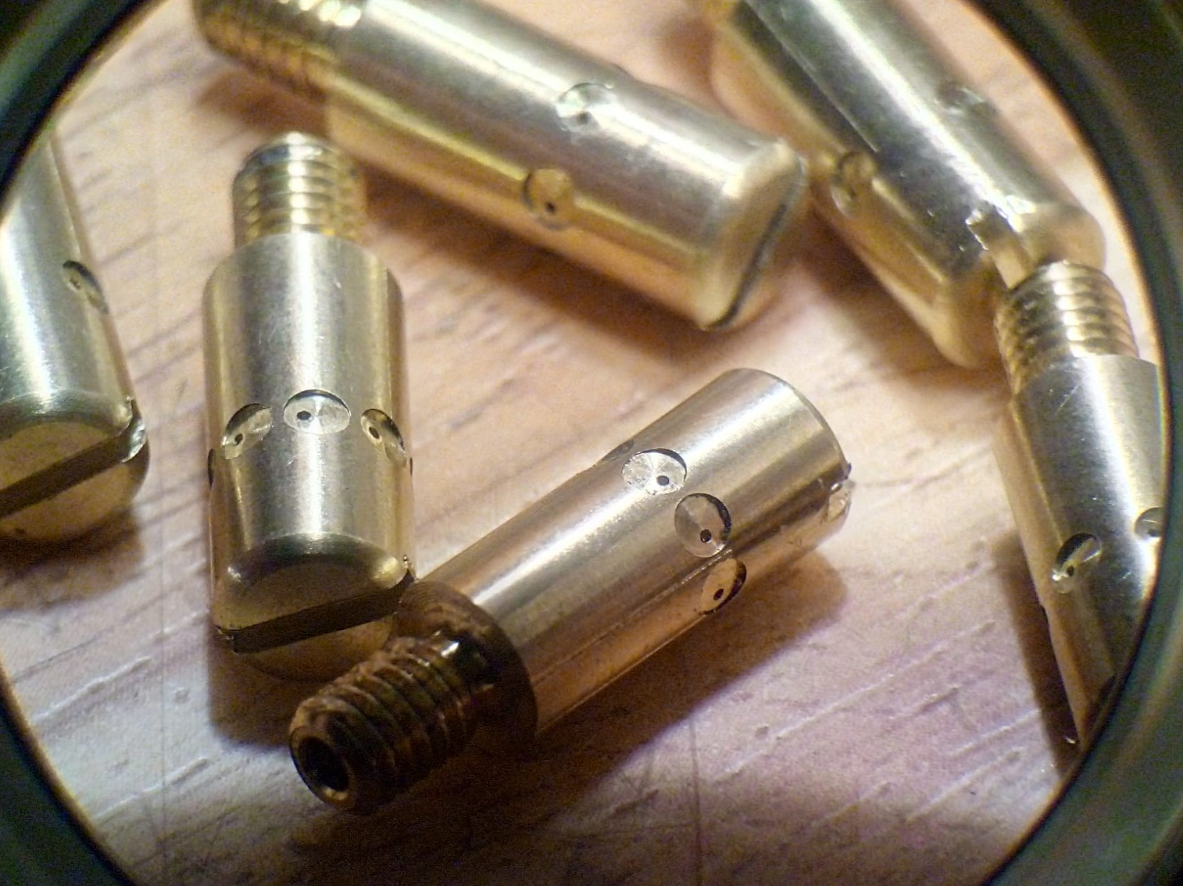 Trysky na nádstavec postřikovače na impregnaci dutin dřevěných stropů, závit M4, díra 2mm vnitřkem a 6x dírky 0.4 po obvodu. Mašina ... Schaublin :) (CNC). Jeden vrták jsem zlomil při vkládání do kleštiny, druhý vydržel 6 děr a ten třetí pak udělal zbylých cca 30 děr, poté co jsem ubral plyn. Původně to mělo být z nerezky, ale nakonec jsem byl rád i za tu mosaz. :mrgreen:
