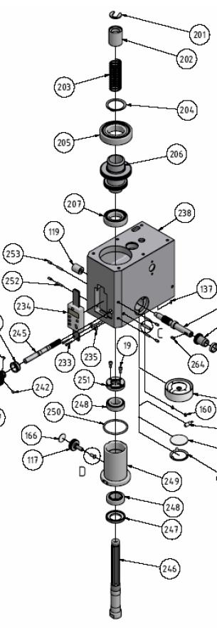 Trochu pomohla plastová podložka kterou drží pružina (203) uvnitř dílu (vrací pinolu nahoru) která je (byla :-() natěsno na drážkovaném hřídeli.