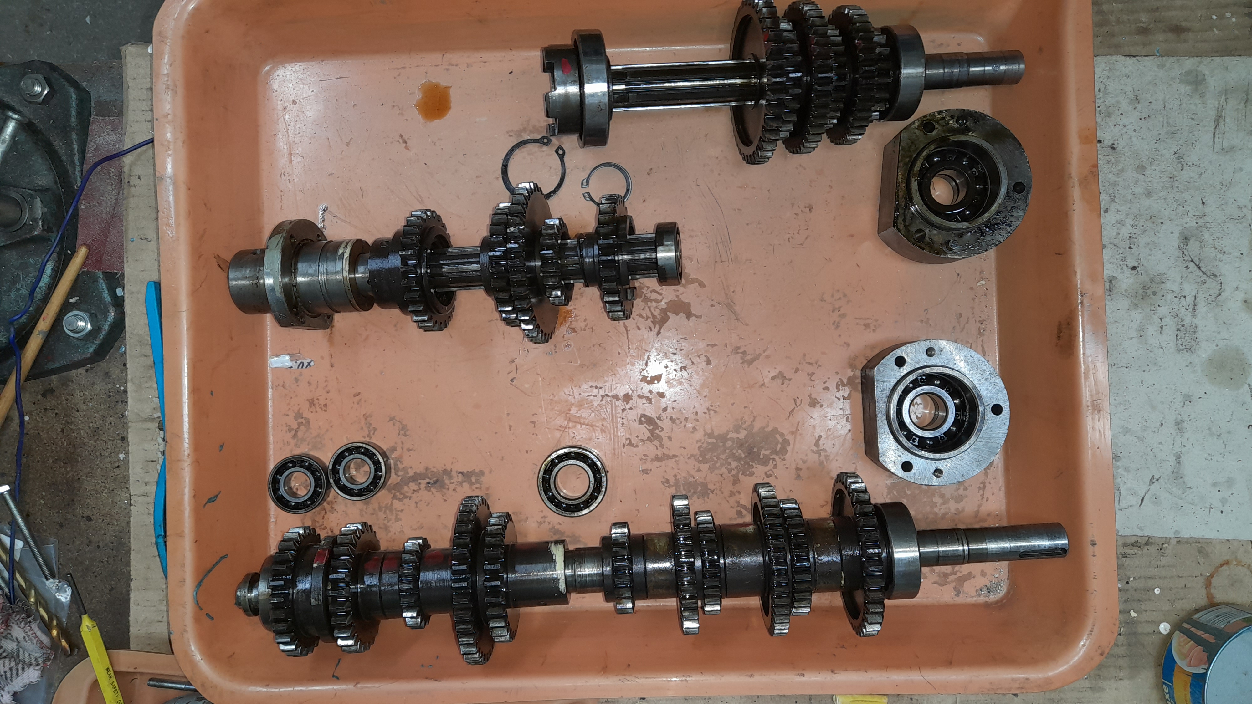 Obě hřídele i s ozubenými koly jsem vymontoval a dolní je po výměně ložisek již namontována zpět.