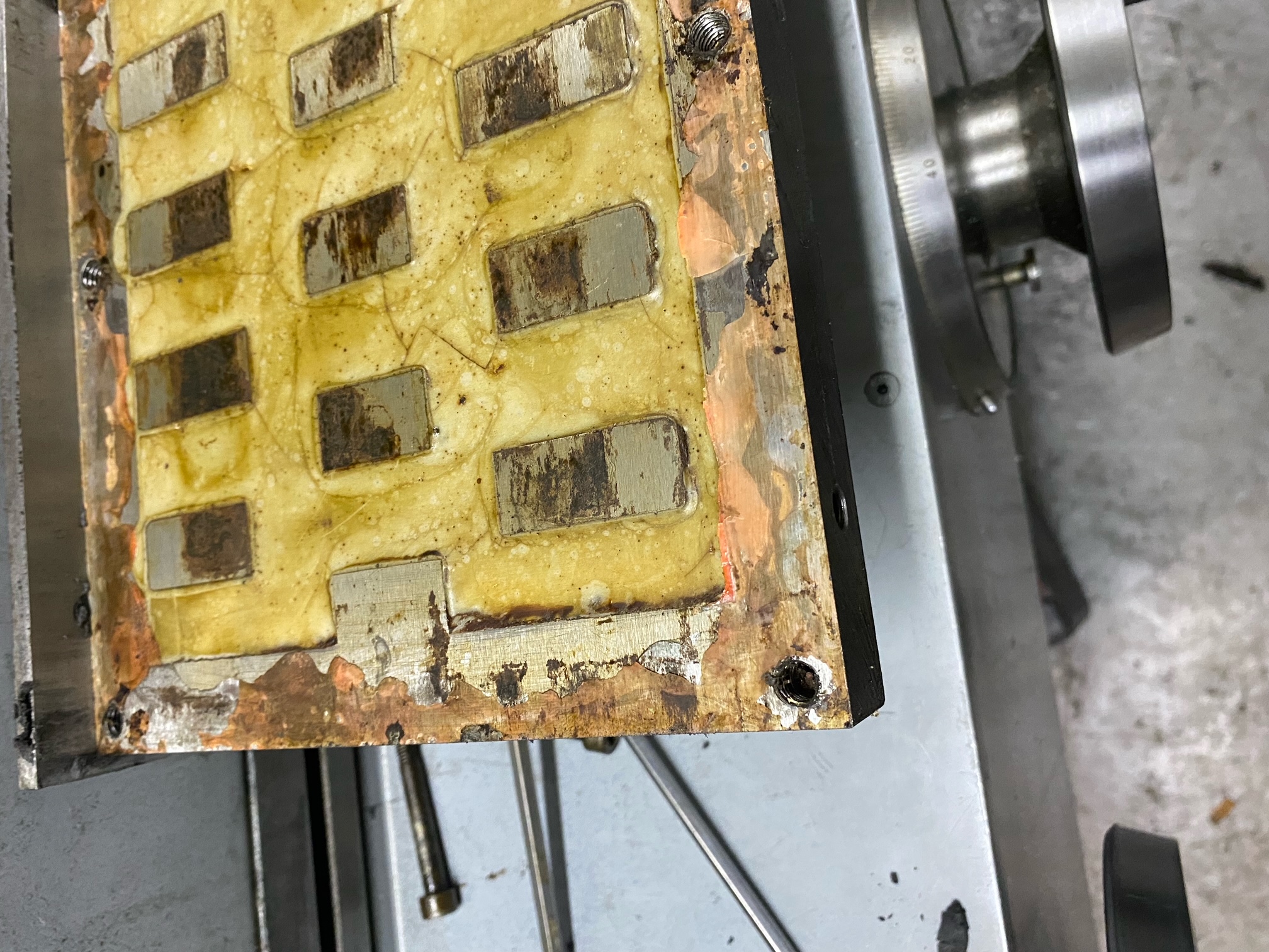 magnet měl někdo rozebranej...ten mosazný plech je místama děravej a kolem dokola byl zalepen nějakou tvrdou hmotou...ale uprostřed ne......tudíž se deska prohejbala