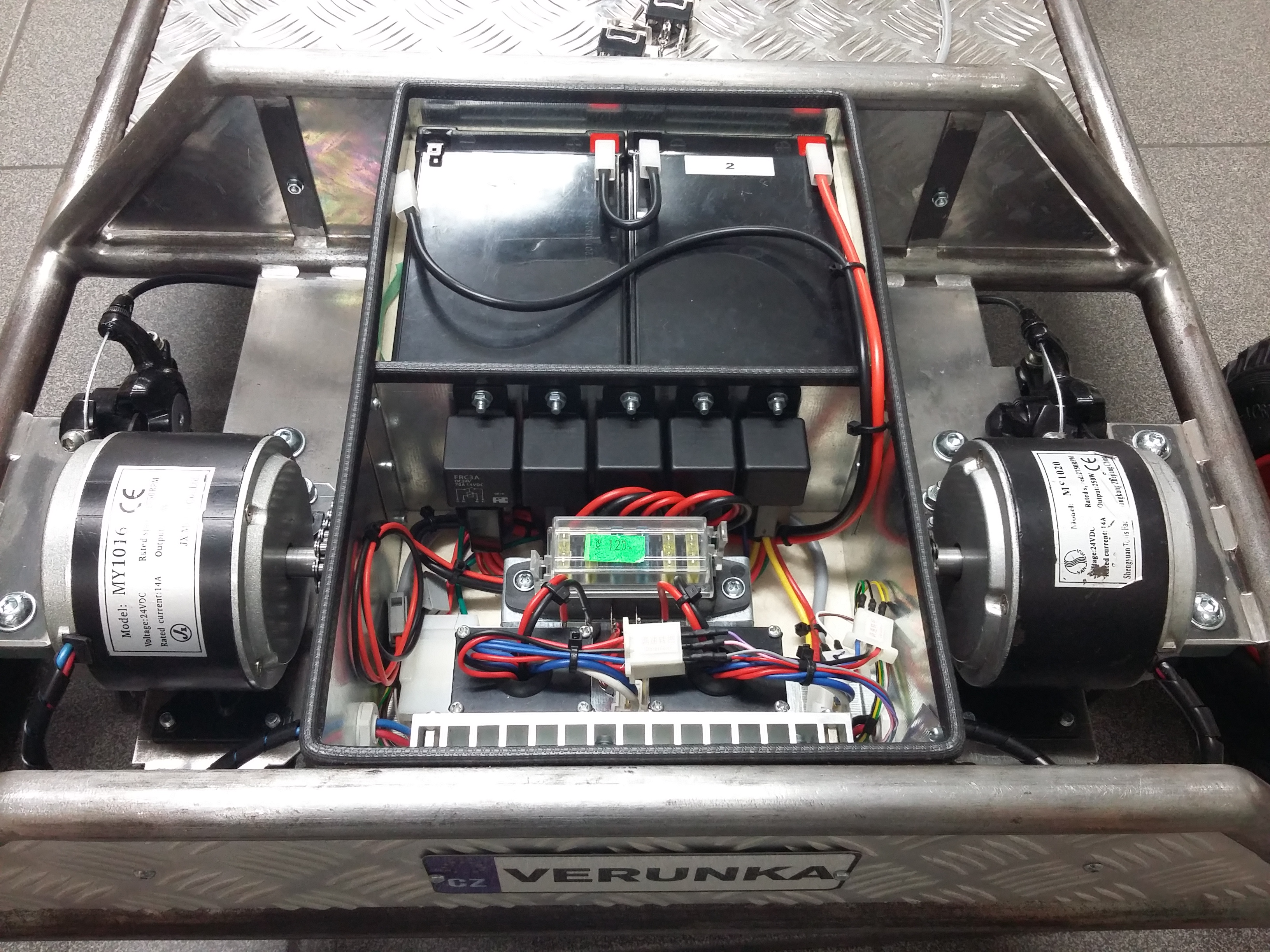 Autíčko má dva motory a dvě samostatné regulace. V prvopočátku byla stejným potenciometrem jen nižší hodnotou snímaná poloha osy volantu a při zatočení se ubíral záběr vnitřního kola (elektrický diferák) Nakonec se ale ukázalo že to jde i bez snímání volantu a zůstal jen jeden tandem na plynový pedál.