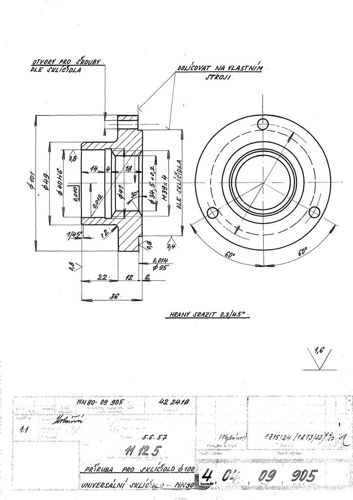 A jako poslední jsou tu příruby pro sklíčidlo pr.80, pr.100 a pr.125. Vše origo výkresy, ale jako standard bylo sklíčidlo pr.80, ostatní na zvláštní objednávku. Zároveň jsou všechny ve starém provedení, od roku 1985 (respektive MN80A/N) se používala příruba pojištěná na vřetenu svěrným kroužkem.