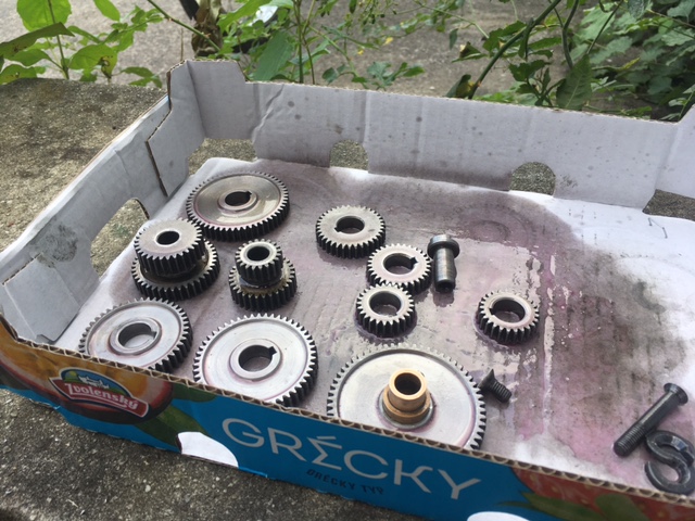 Prikladam aj fotky stavu pred a potom stavu po. Ozubene kolecka som umyl v benzine s vyraznym mnozstvoj oleja a potom napenetroval reznym olejom. Zatial, kym to zlozim. ********************