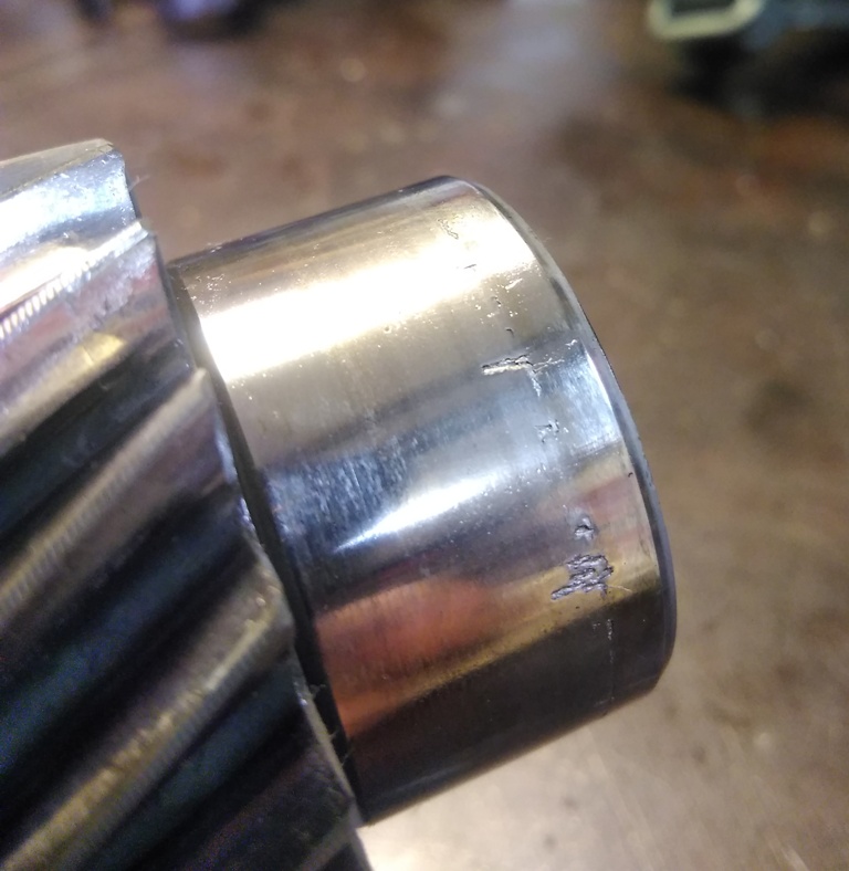 je načatej (pittingy, únavové poškození viz foto) povrch čepu kterej dělá vnitřní kroužek válečkovýho ložiska na pastorku stálého převodu