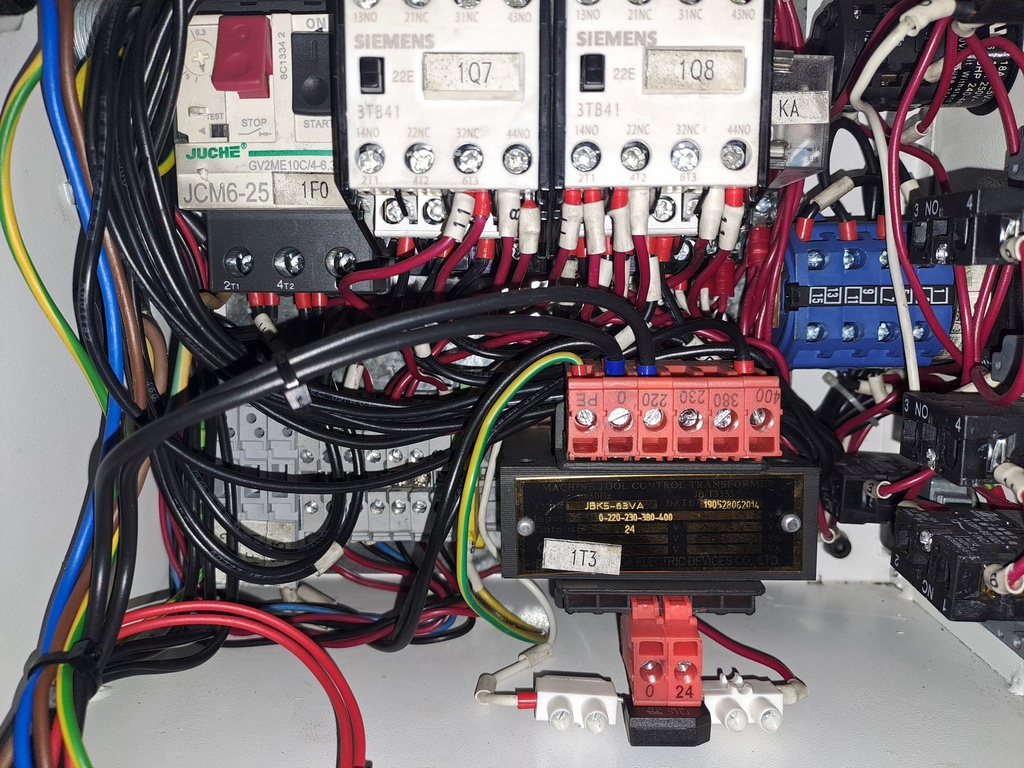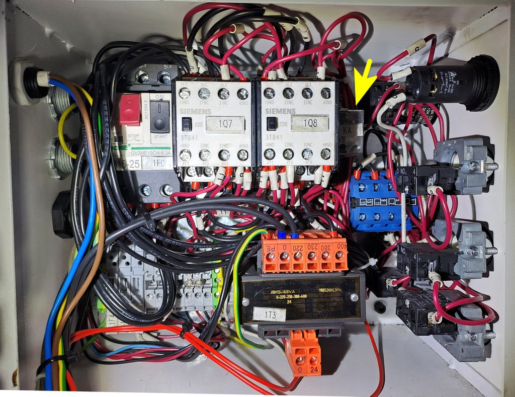 Po pár dnech používání mi začalo velmi vadit, že v klidovém stavu ( samozřejmě po zapnutí hlavního jističe a stisku tlačitka "I" ) frézka velmi nepříjemně bzučí. Puvodně jsem si myslel, že zdrojem bzučení je síťový transformátor, ale po shlédnutí schématu jsem usoudil, že bzučení způsobuje relé. Protože toto relé je napájeno střídavým napětím 24V, tak má důvod bzučet. Je spodivem, že u stroje s cenou cca 100tis korun výrobce neinvestoval dalších několik korun, aby tuto nepříjemnost ošetřil. Předpokládám, že tento nešvar se bude vyskytovat u většiny podobných čínských mašin a dále popisovaná úprava tak může být užitečná i pro řadu dalších strojů.