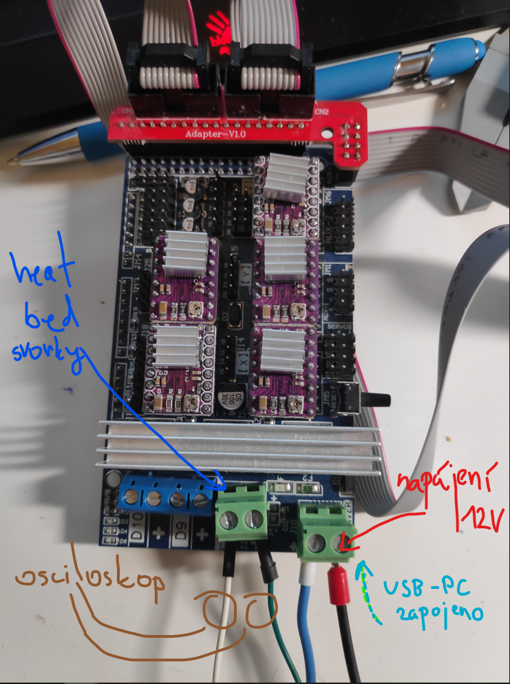 Stavím si 3d tiskárnu a hrál jsem si s Arduino mega+Ramps 1.6 kde je Marlin. Arduino bylo zapojeno na PC, ramps byl napájen ze zdroje 12v. Chtěl jsem se podívat na to, jaký signál vychází z svorky kde by měl být připojený heat bed. Nasimuloval jsem si teplotu potenciometrem, který byl zapojený na místo kam patří termistor.