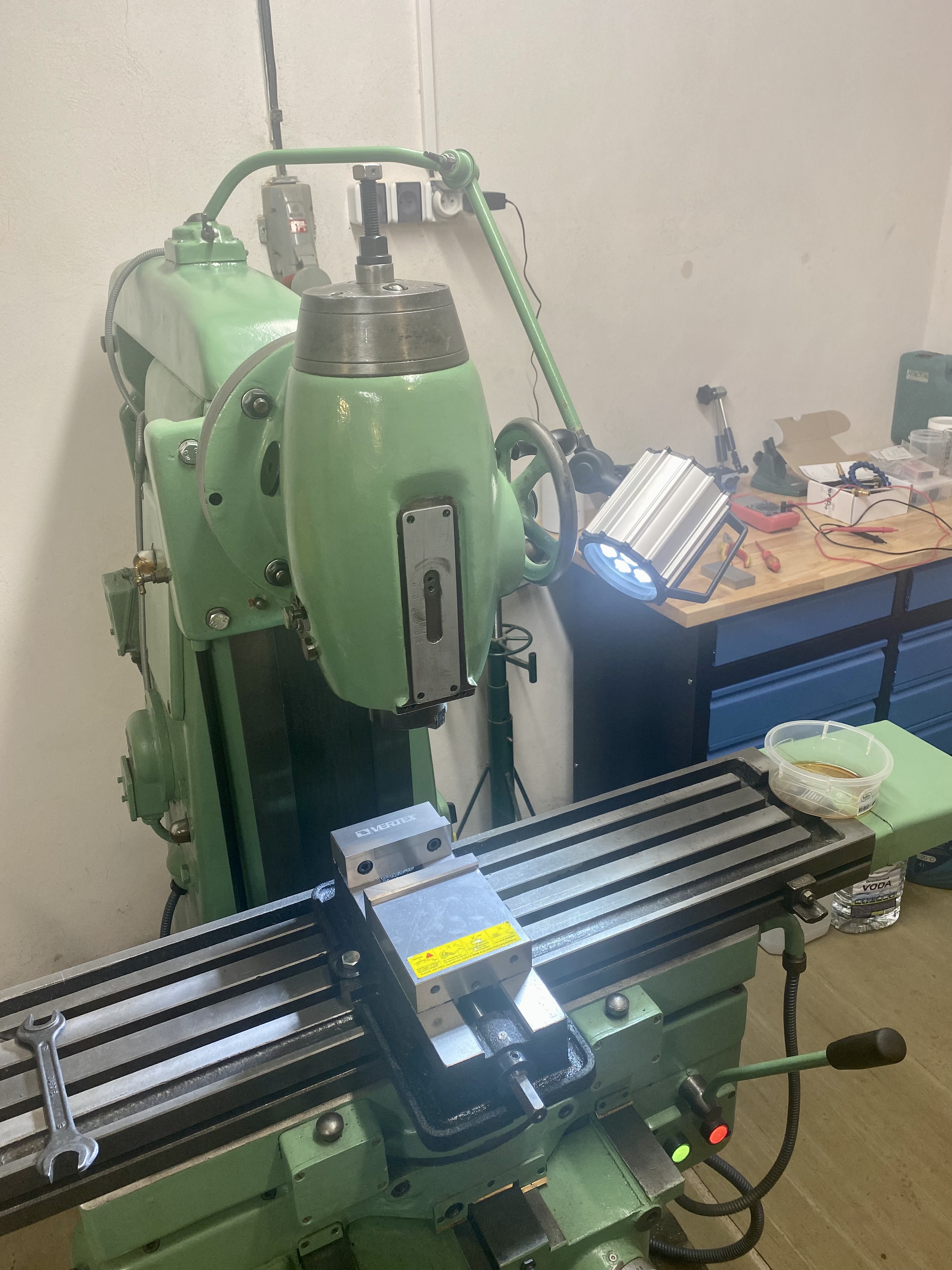 3) Křížové hlavy. Chápu jak se do vertikální hlavy upíná horizontální fréza, aby bylo možno frézovat hřebeny. Zde jsem viděl upínání pomocí obdélníku. Nevím jak je zajištěno, aby nechtěla tato osa pro upnutí frézy vycestovat ven. Patrně bude rozšířena před pomocným ložiskem. Vůbec však netuším, kam se upíná normální fréza Připojuji foto dvou hlav. Na zelené hlavě je zepředu nějaké tlačítko. K čemu slouží k mazání? K vyklepnutí nástroje z morse kužele? U té světle zelené tam tlačítko chybí nebo je to nějaká osa?
