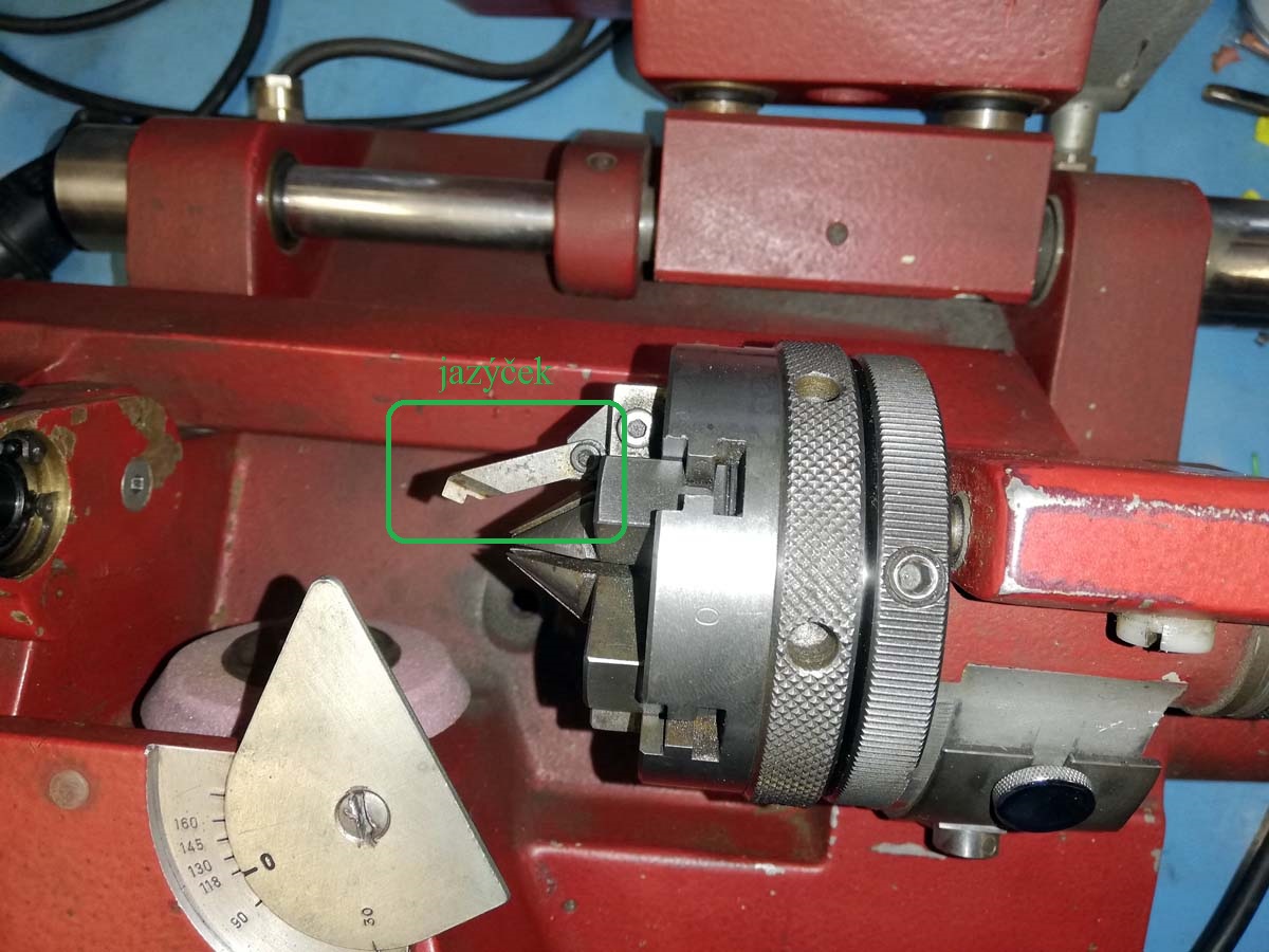 - jazýček je doraz pro nastavení vrtáku před broušením, jazýček se sklopí, vrták se o něj rohem břitu lehce opře, univerzálka se dotáhne, jazýček odklopí a brousí se.