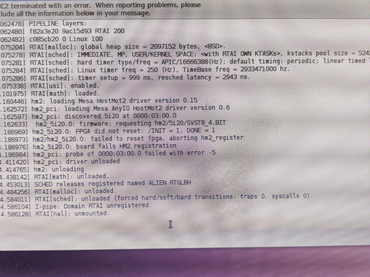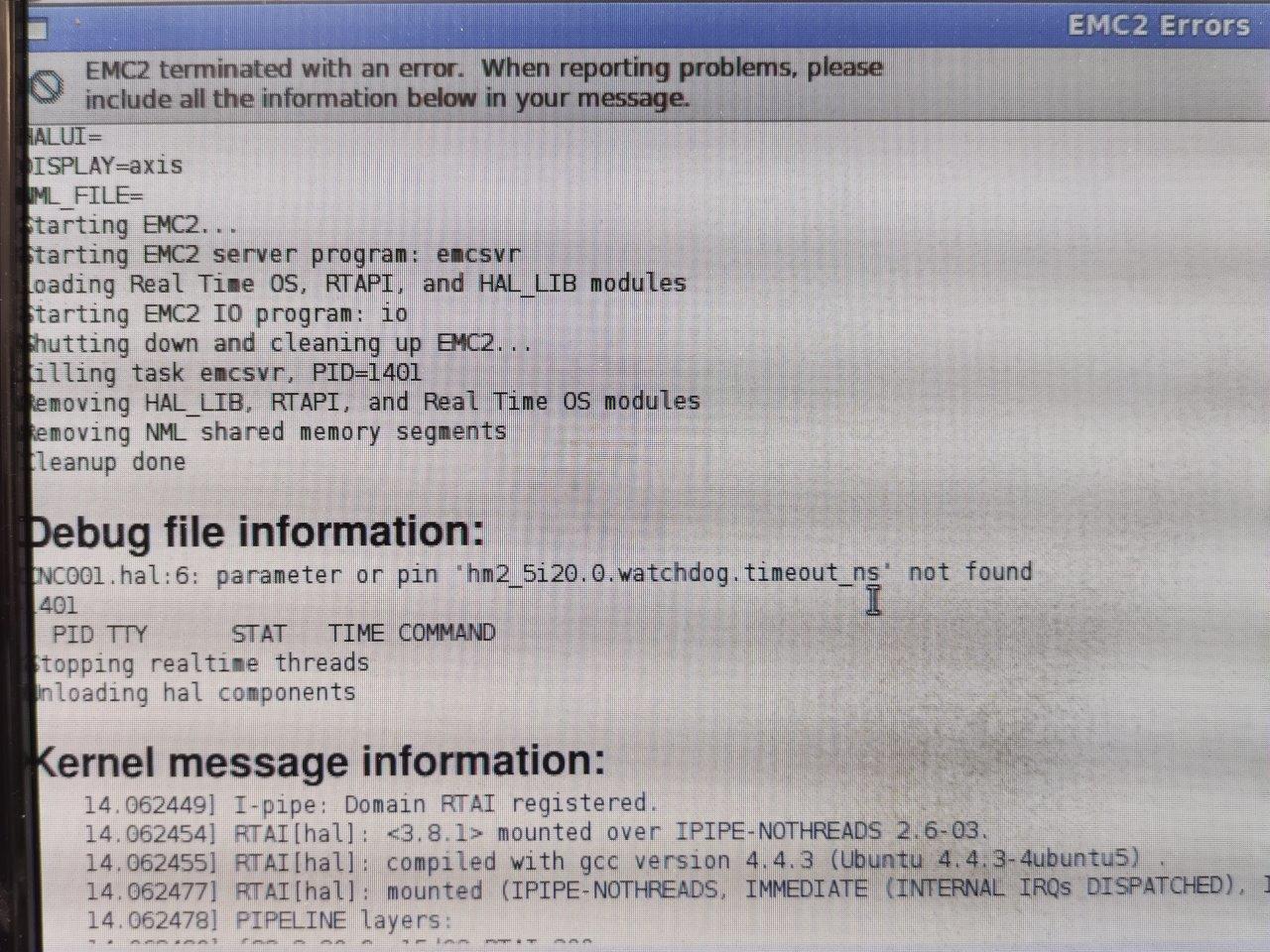 po odstávce jsem spustil CNC stroj a nefunguje mi. V krabici nesvítí drivery, a emc2 se nenačte, Počítač se tváří, že funguje, svítí, linux naběhne, emc píše chyby viz fotky. Na stroji je EMC2 + mesa karta. Servisoval mi to jeden šikovný pán, ale ten jaksi zmizel...