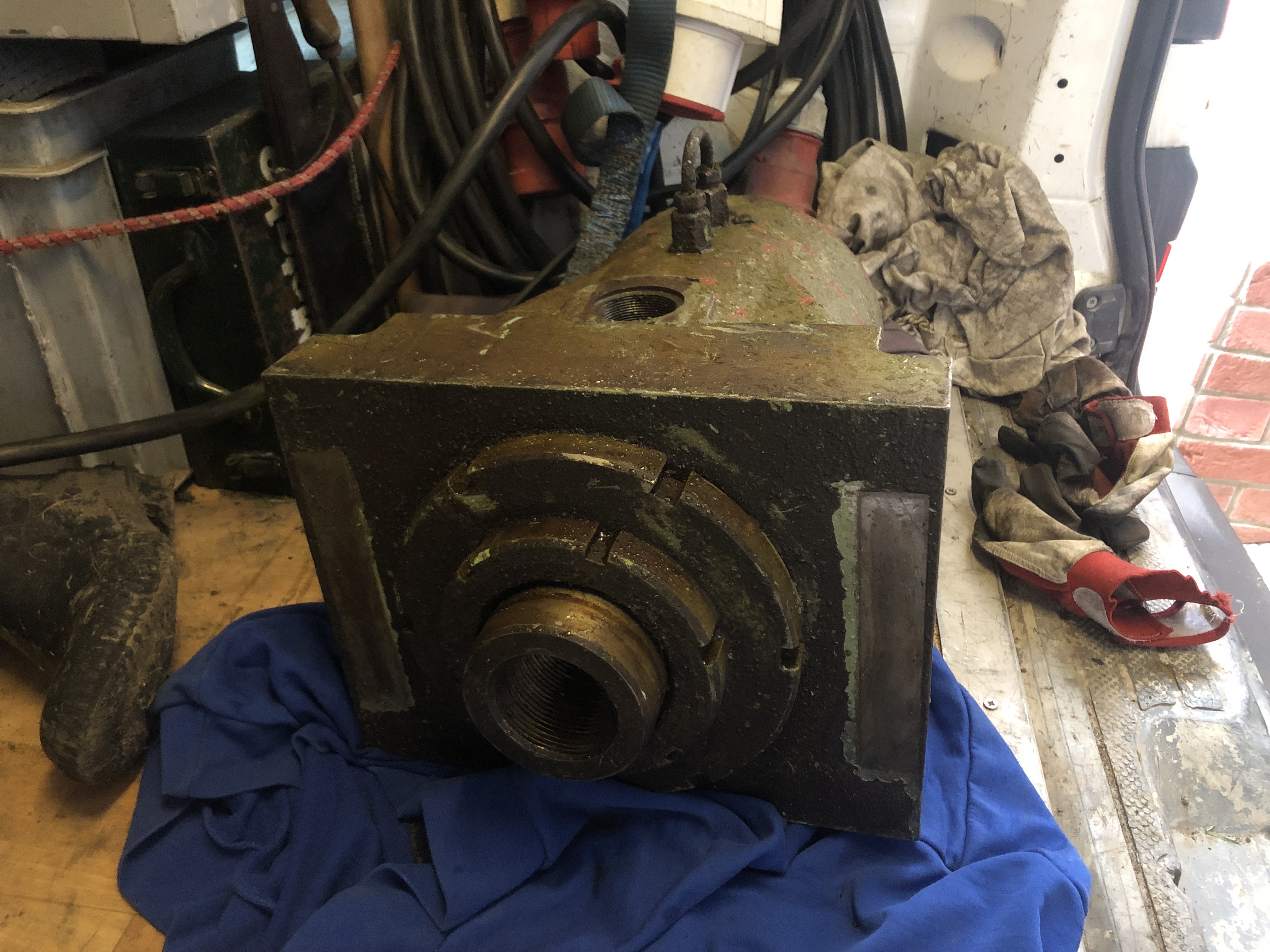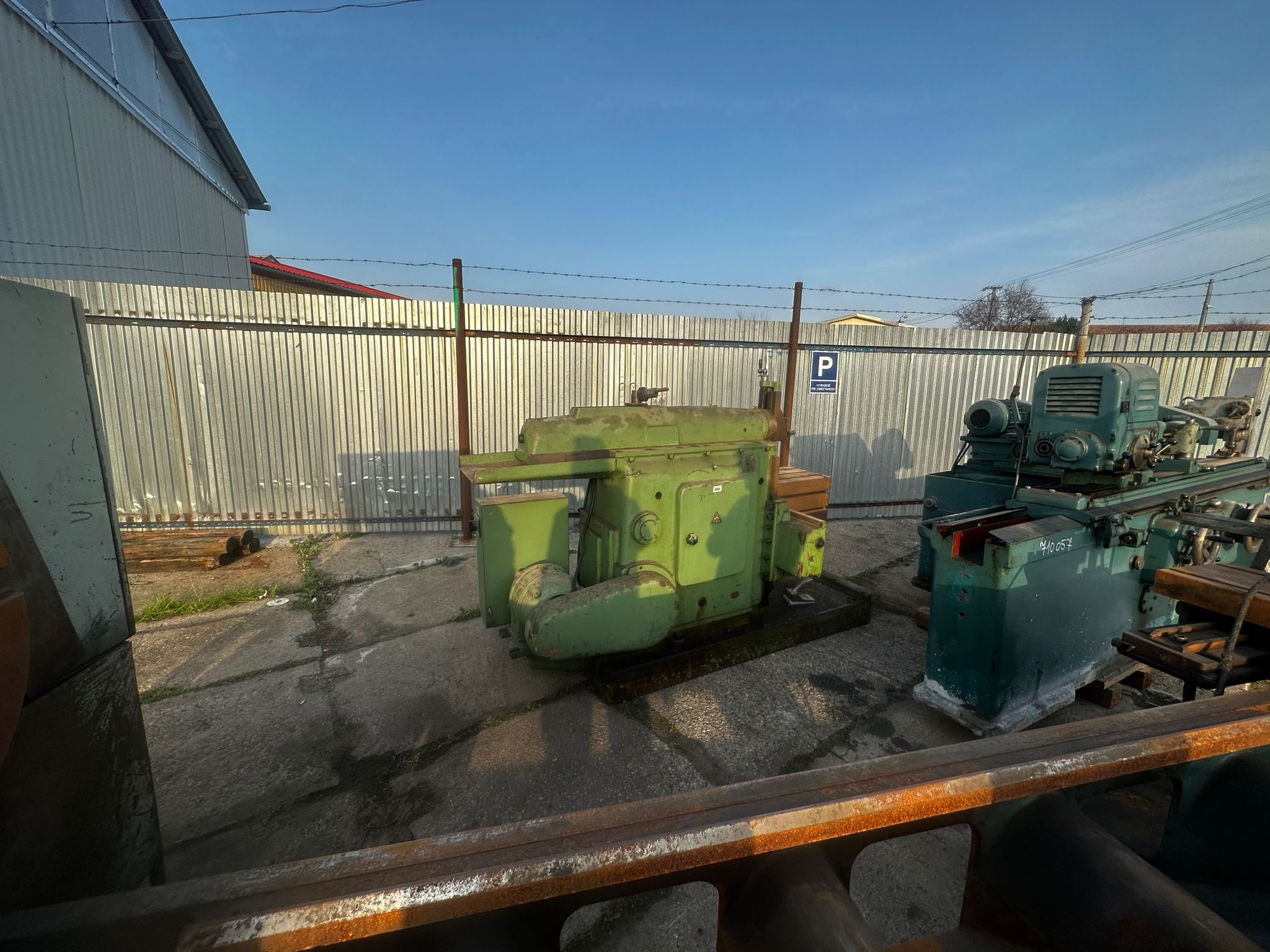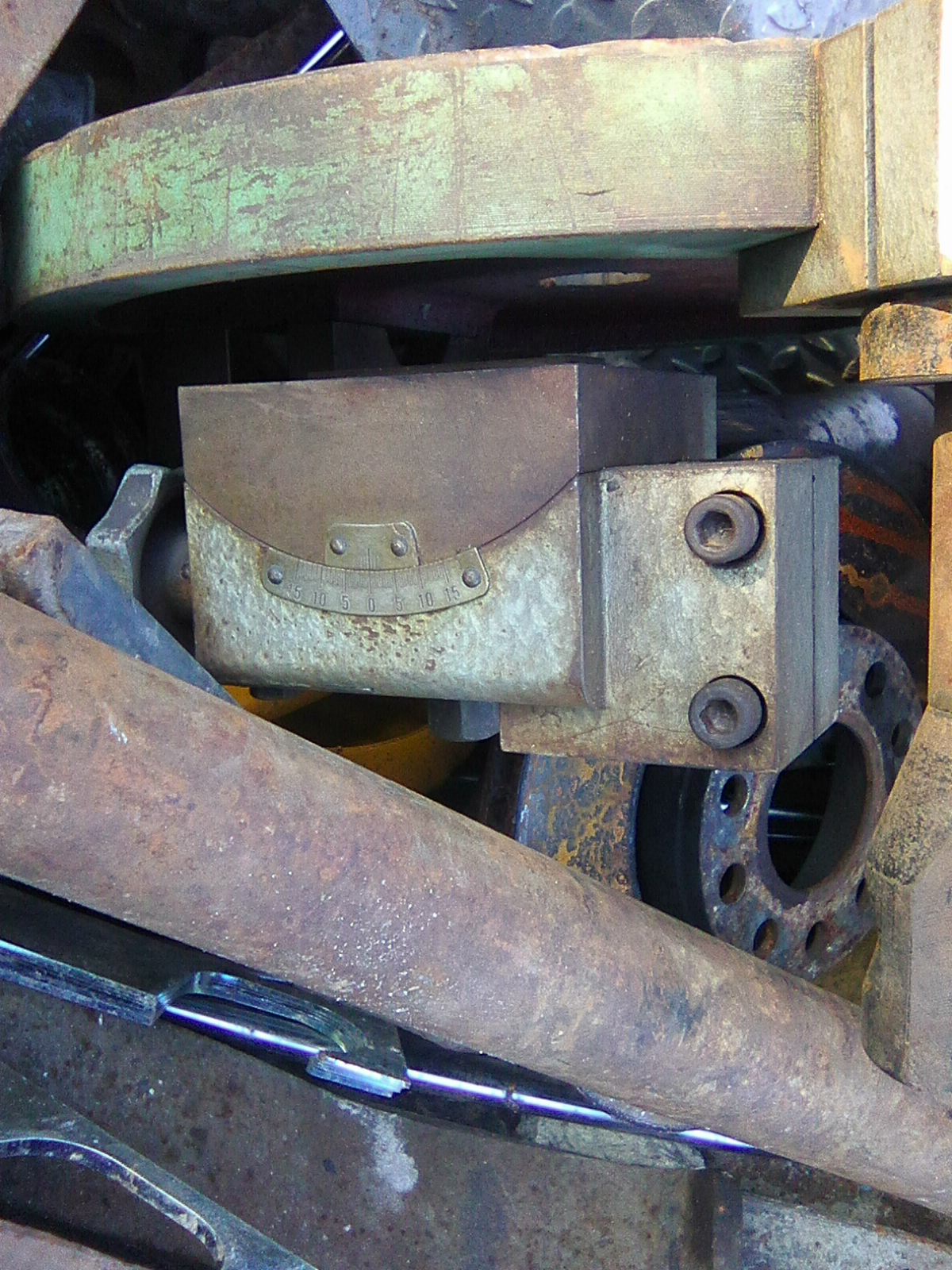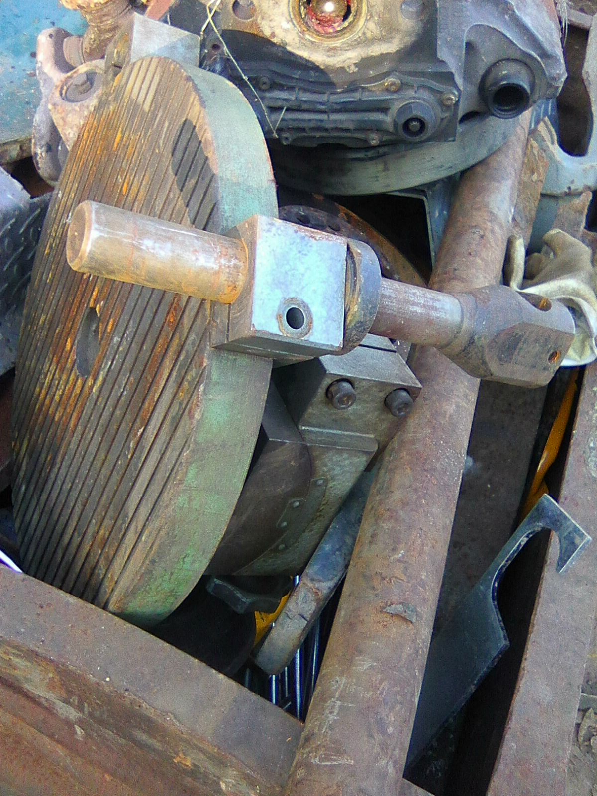 Slaný, kruhový stolek z české pilovačky, pr. cca 400 mm, naklápěcí ve dvou směrech, vedle v kontejneru příslušná pilovačka.