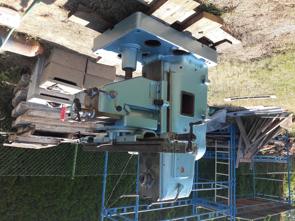 Taky jsem si jí pořídil. Původně jsem o frézce neuvažoval, jenže tahle měla jít do šrotu, tak za u cenu jsem neváhal. Štěstí je, že je ve verzi s rychlostí vřetene 95-1500ot/min. Mám k ní horizontální rameno s ložiskem i vertikální hlavu bez poškozeného soukolí. Převody i strojní pojezdy fungují. Ale je ulomená hřídelka pro ruční kliku veritikálního zdvihu stolu. Vzhledem ke stáří (1938) je v celkem slušném stavu, byla v dílně údržby, posledních 30 nejela. Naštěstí byla tak zmazaná olejem, že není nikde vyrezlá. Původní elektro výstroj jsem pro jistotu zdemontoval.