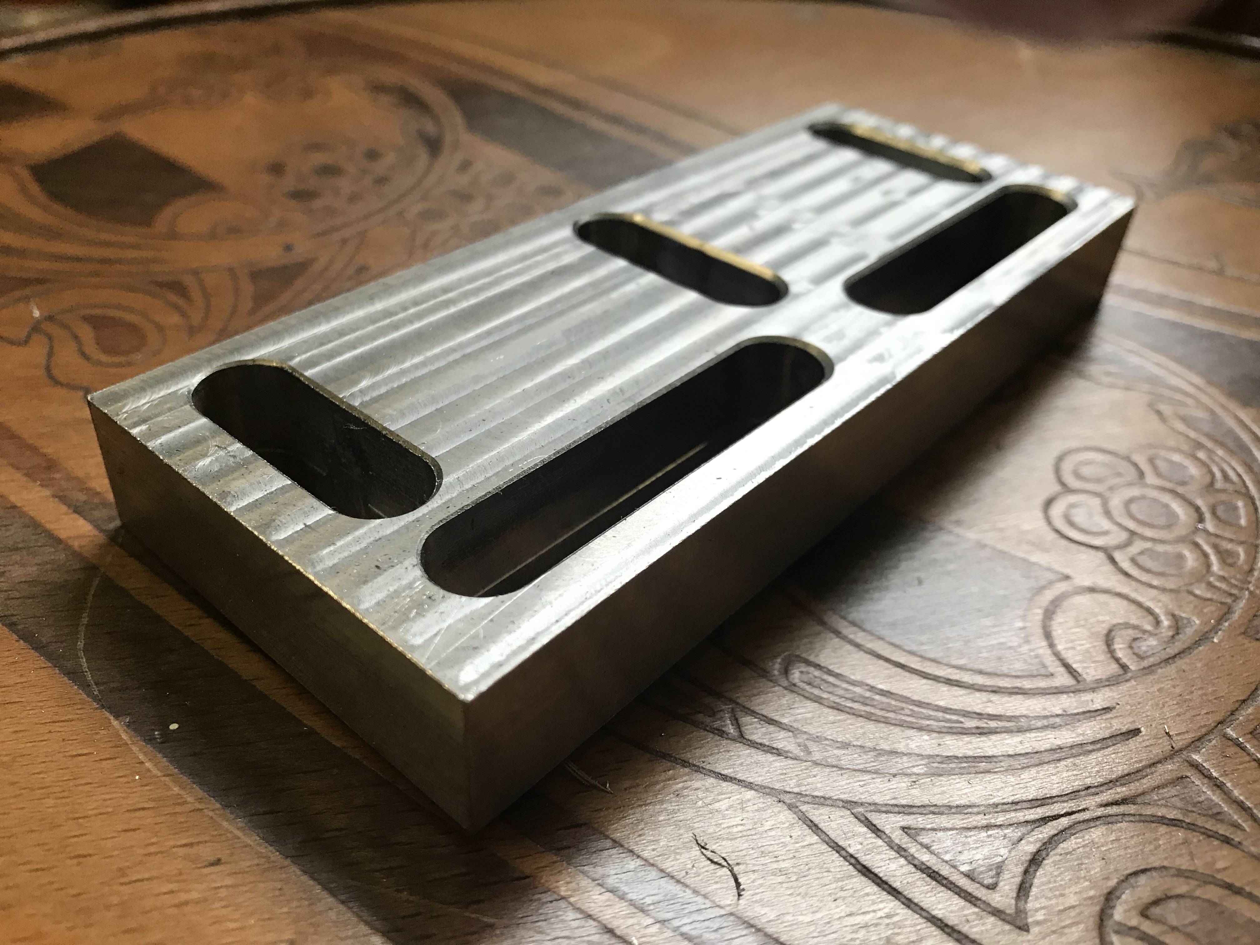 Je to nizkoprofilova upinka na stol, material konstrukcna ocel. Na tom povrchu vrchnej strany sa mi paci, ze v porovnani s predchadzajucimi pokusmi s cinskymi kliestinami takmer nie su vidno kruznice po nastroji, len riadky, ale tomu sa uz asi so 6kou frezou nevyhnem. Fly cutter je uz objednany.