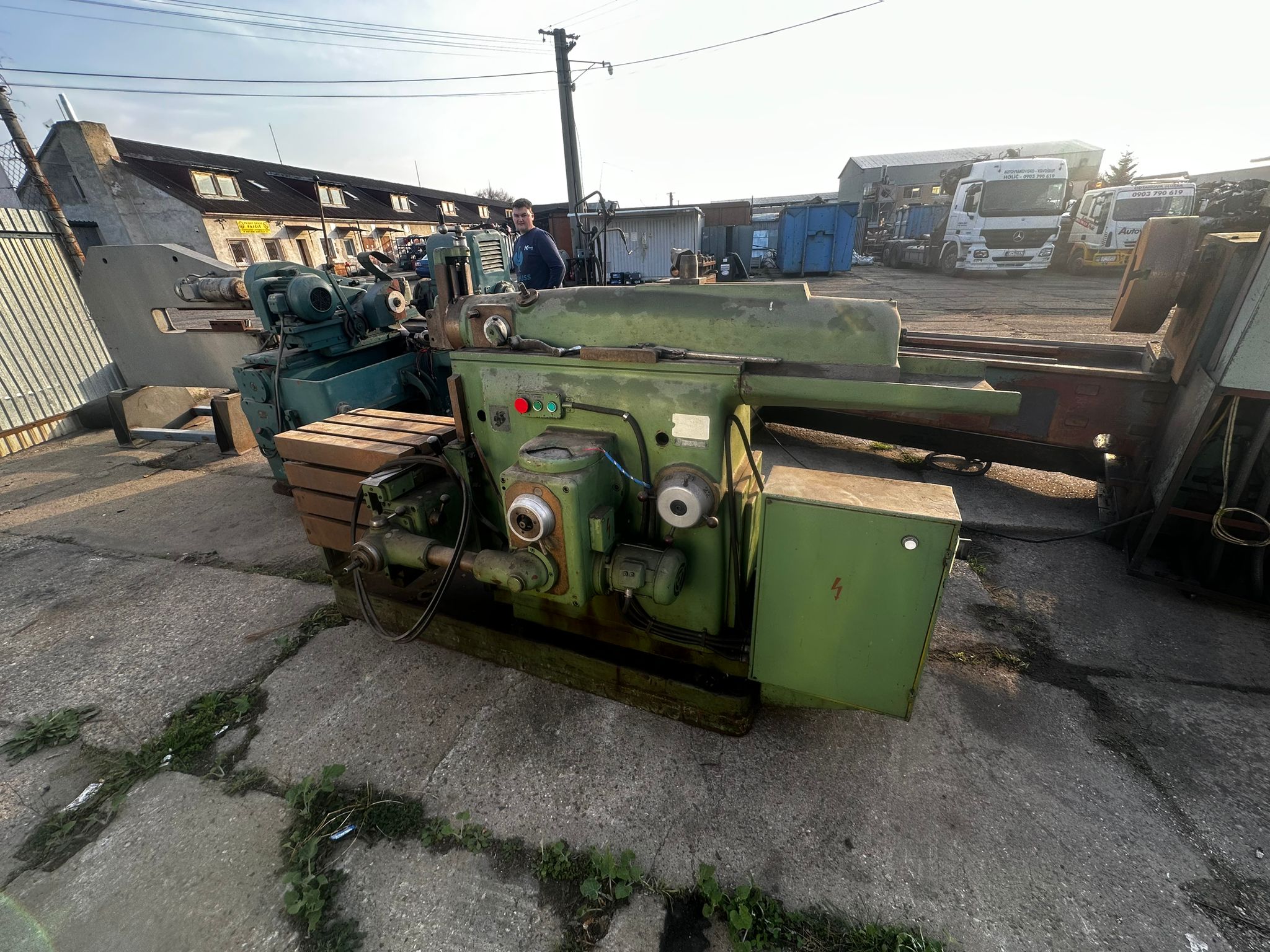 Slaný, kruhový stolek z české pilovačky, pr. cca 400 mm, naklápěcí ve dvou směrech, vedle v kontejneru příslušná pilovačka.